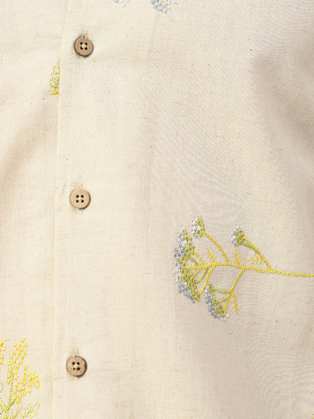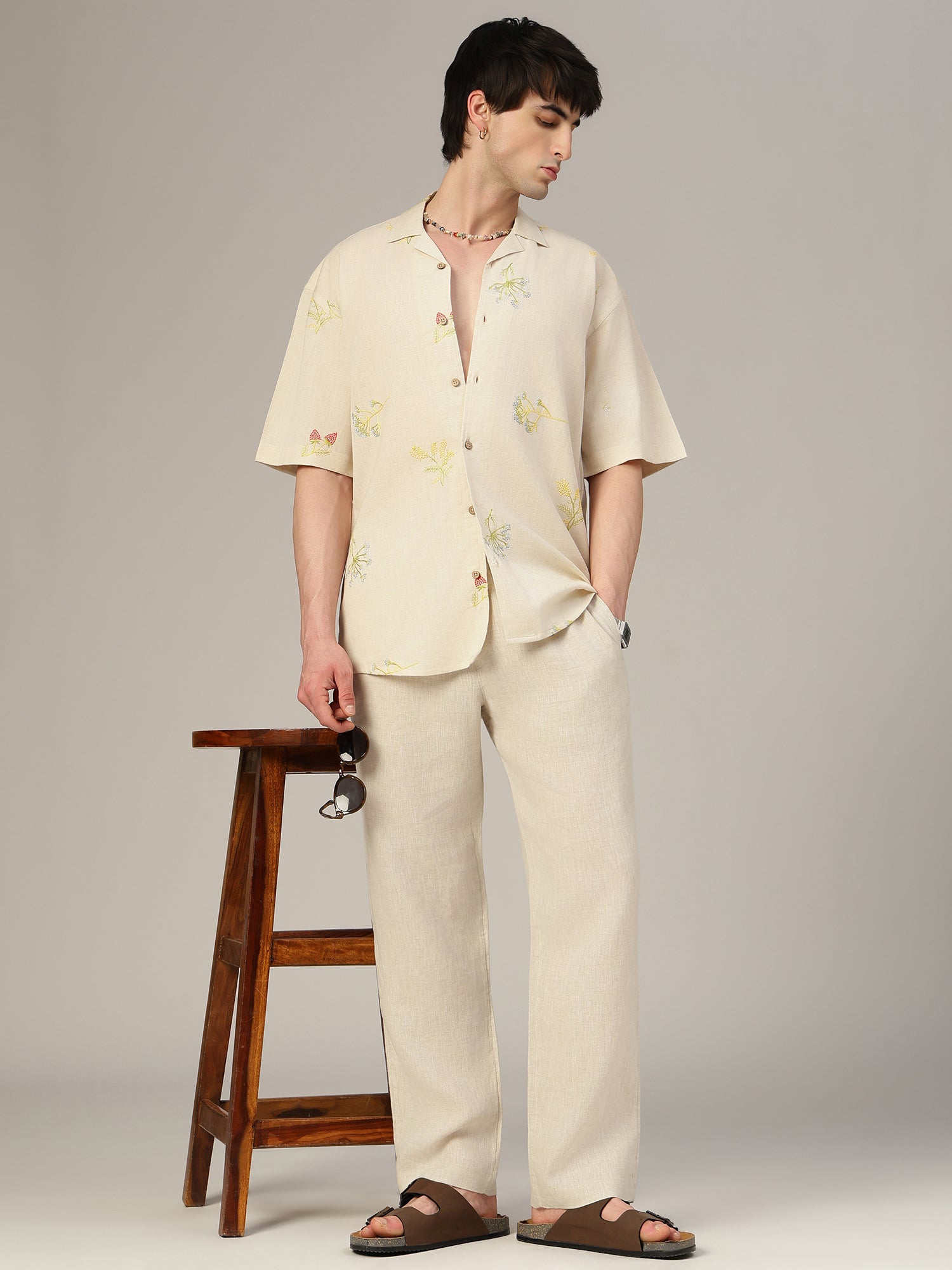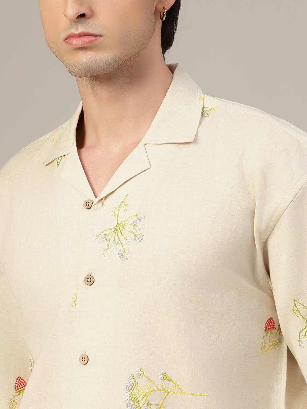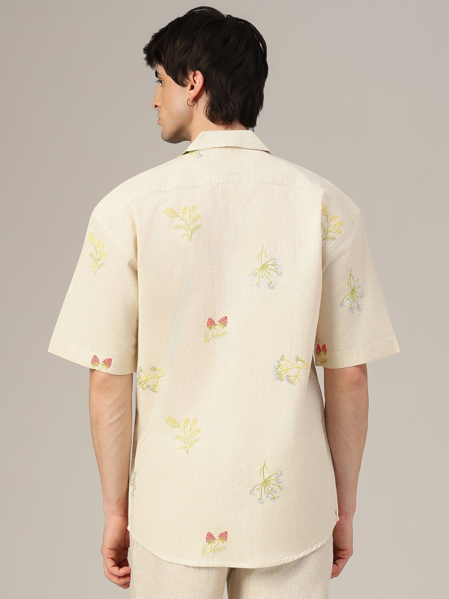 This Oversized Embroidered Shirt is a stylish Casual Shirt featuring a Cuban Collar, Half Sleeves, and Drop-Shoulder design. Crafted from breathable Cotton Linen with a Curved Hemline, it offers comfort with a standout look.