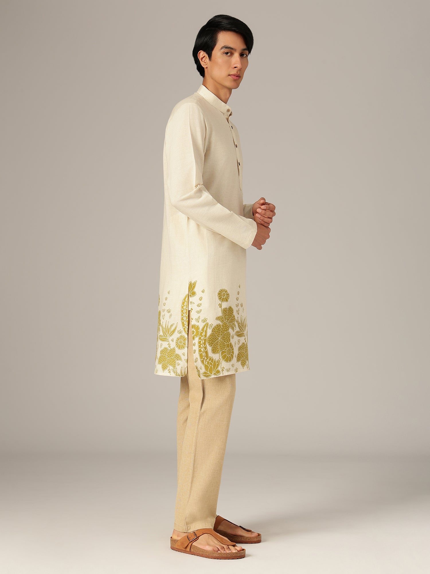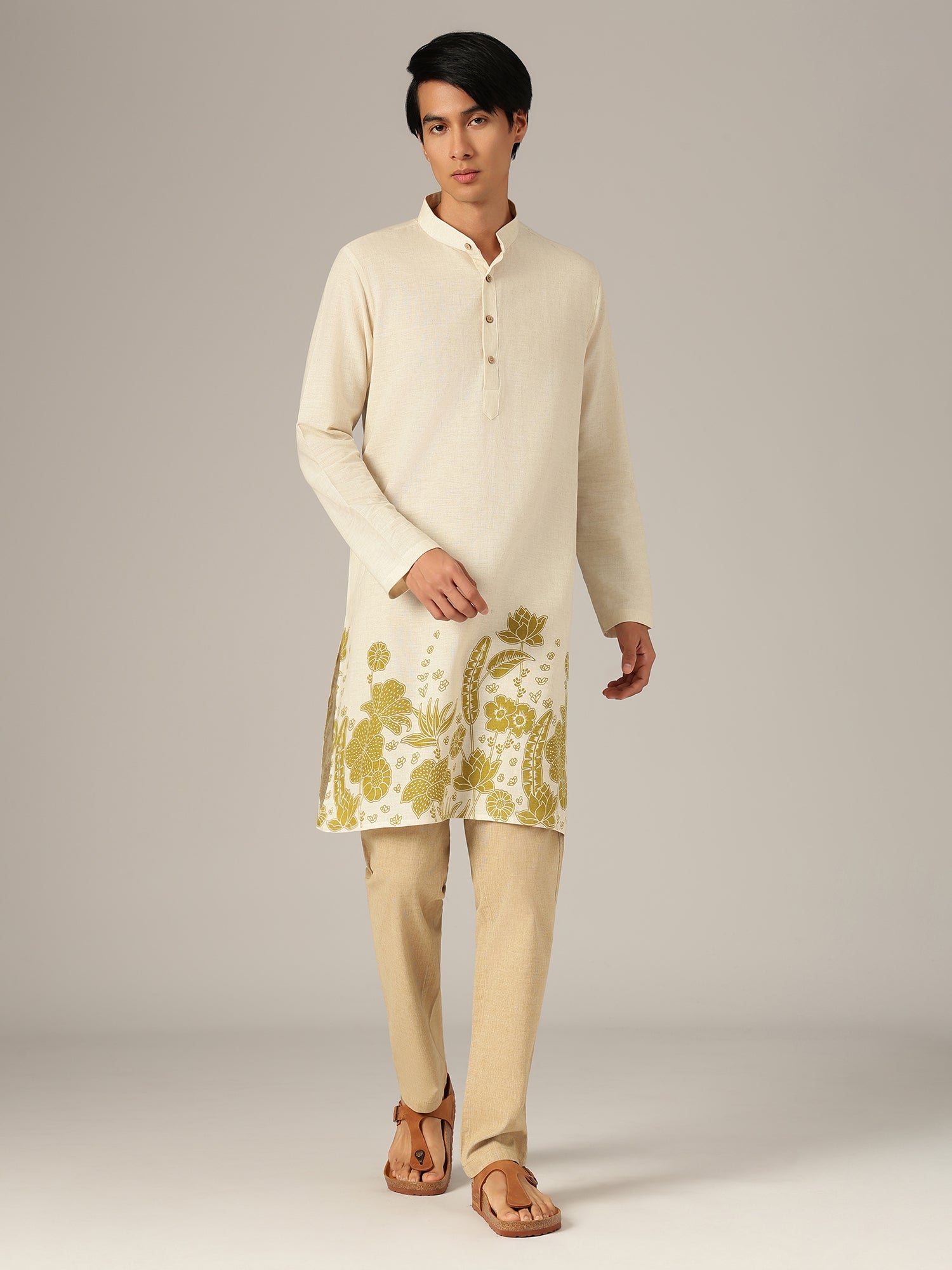 This regular fit floral printed kurta is crafted from soft cotton, featuring a mandarin collar, long sleeves, knee length silhouette, straight hemline, and side slits, offering breathable comfort and graceful movement in soothing pastel shades.