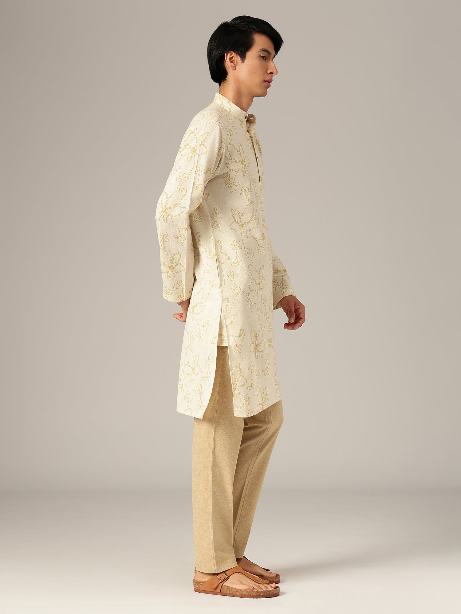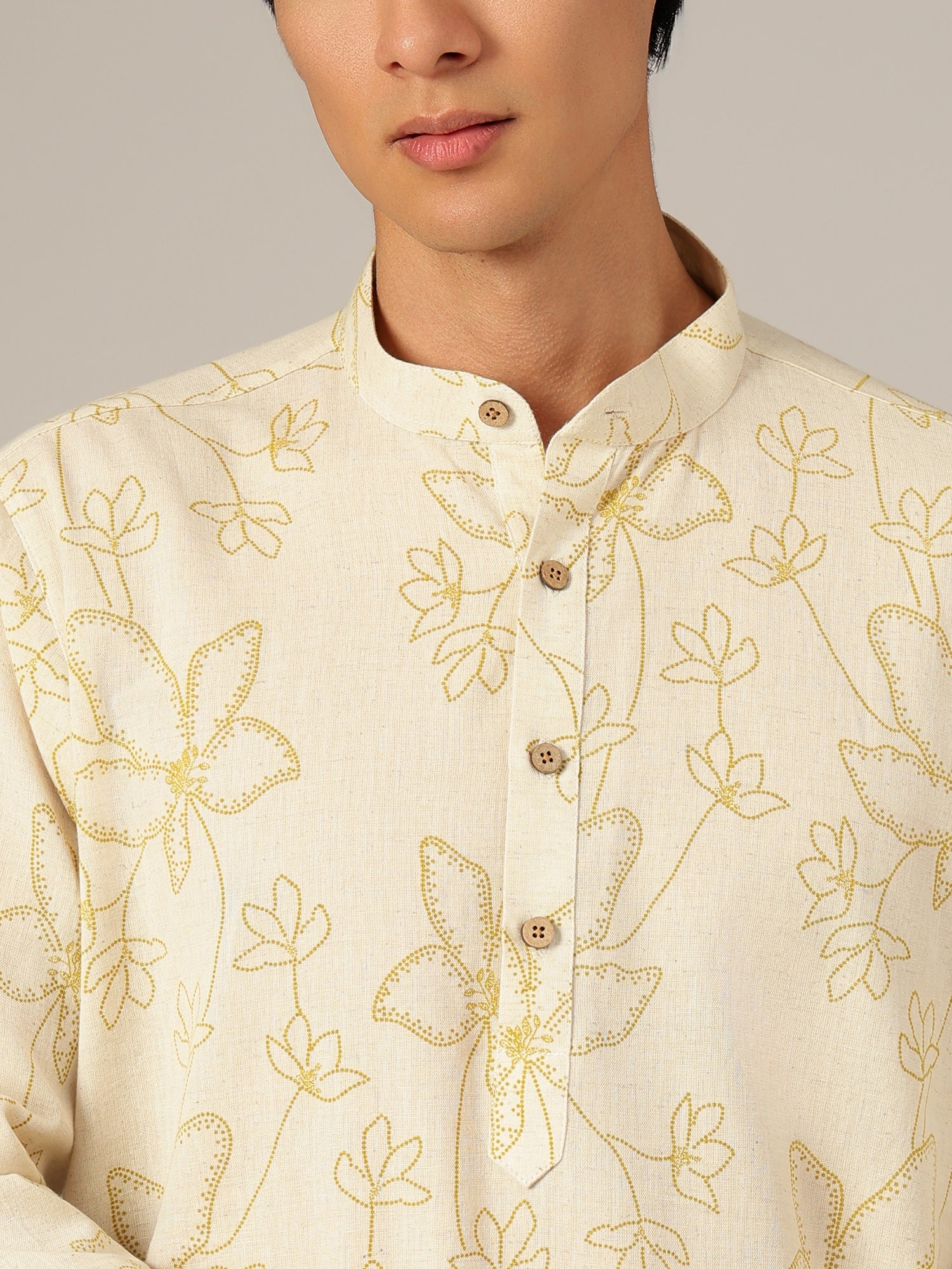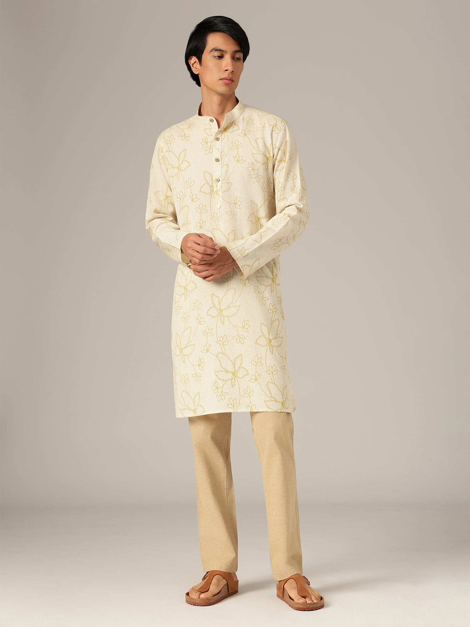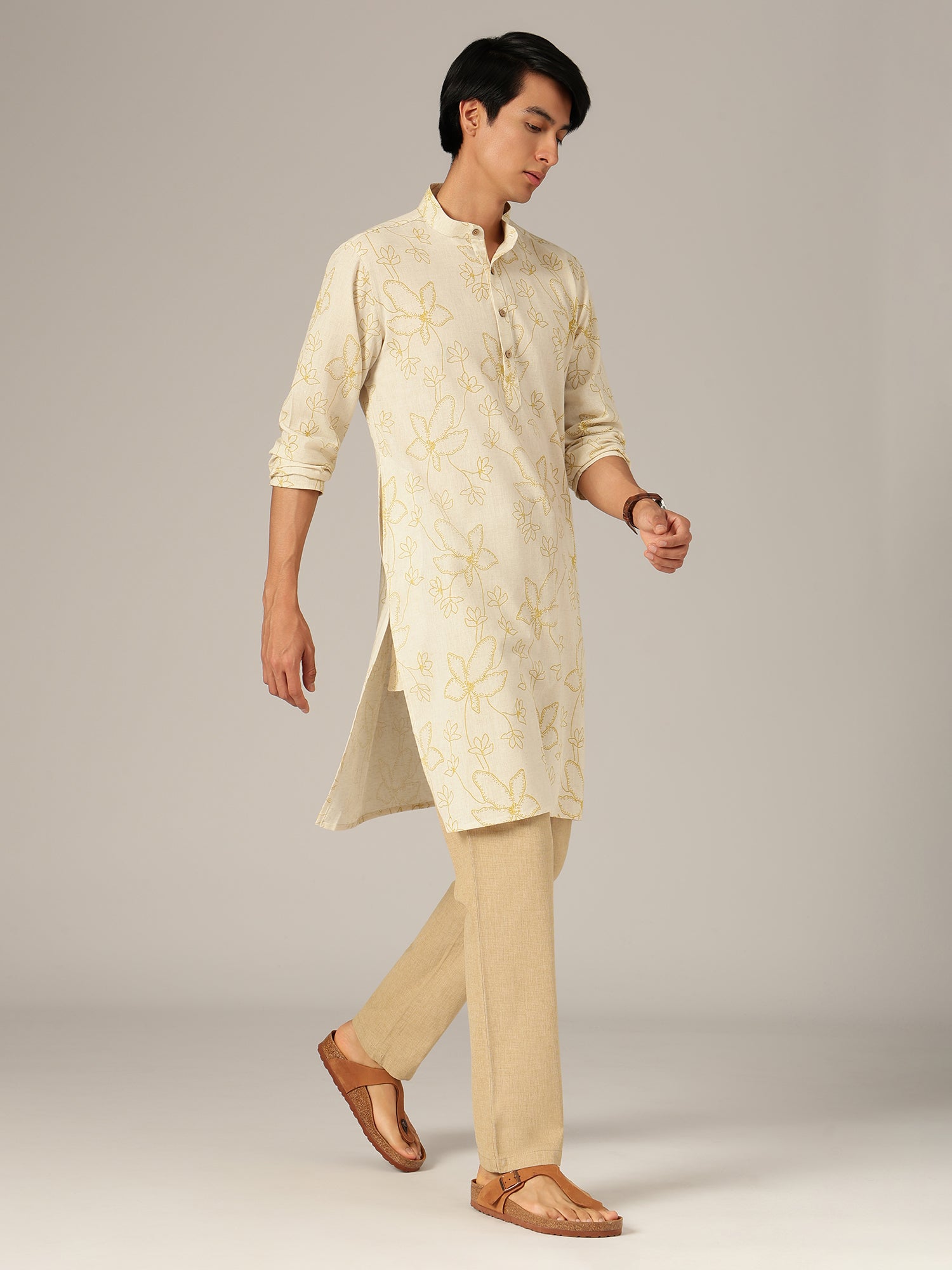 This regular fit floral printed kurta is crafted from soft cotton, featuring a mandarin collar, long sleeves, knee length silhouette, straight hemline, and side slits, offering breathable comfort and graceful movement in soothing pastel shades.