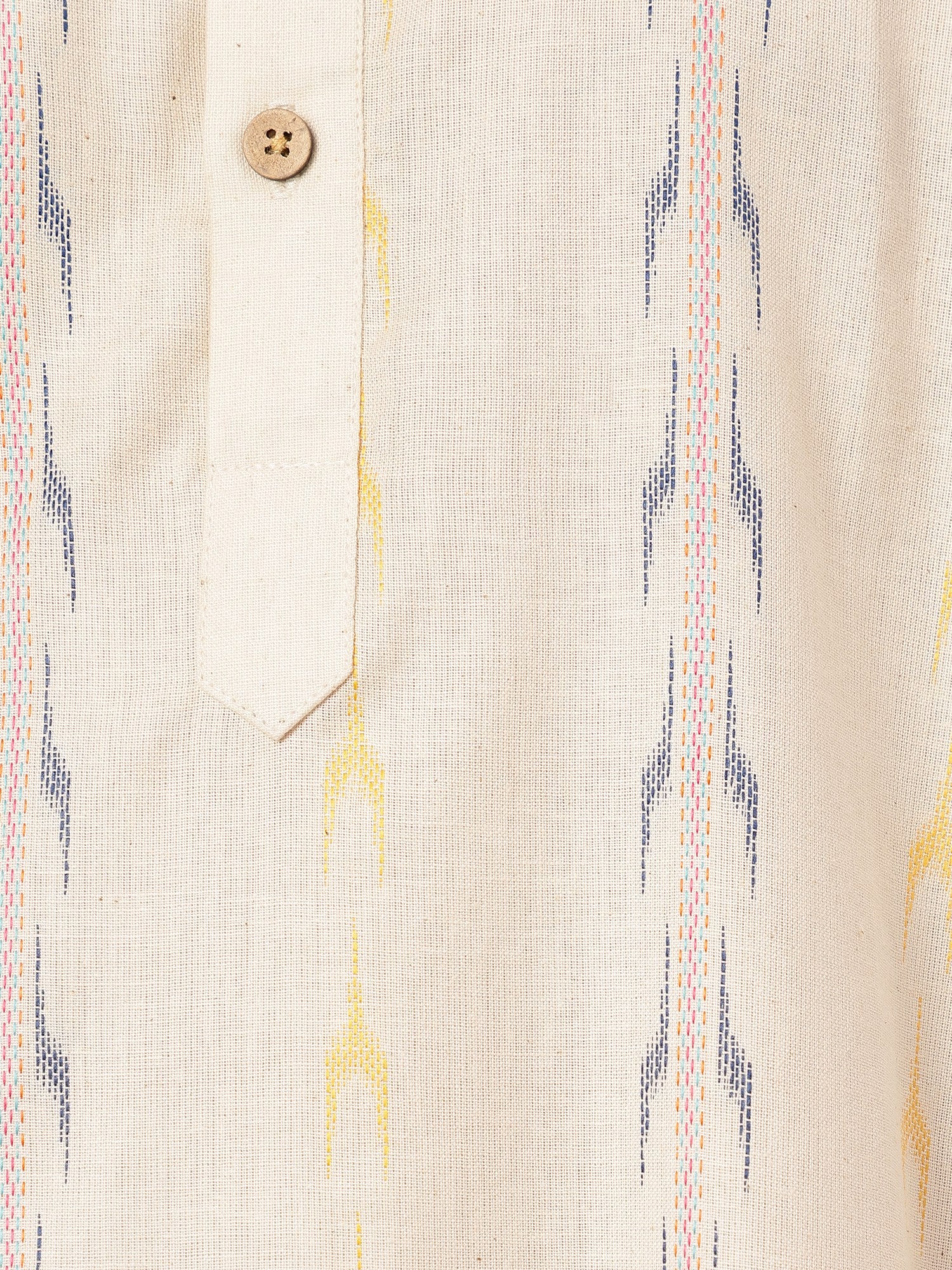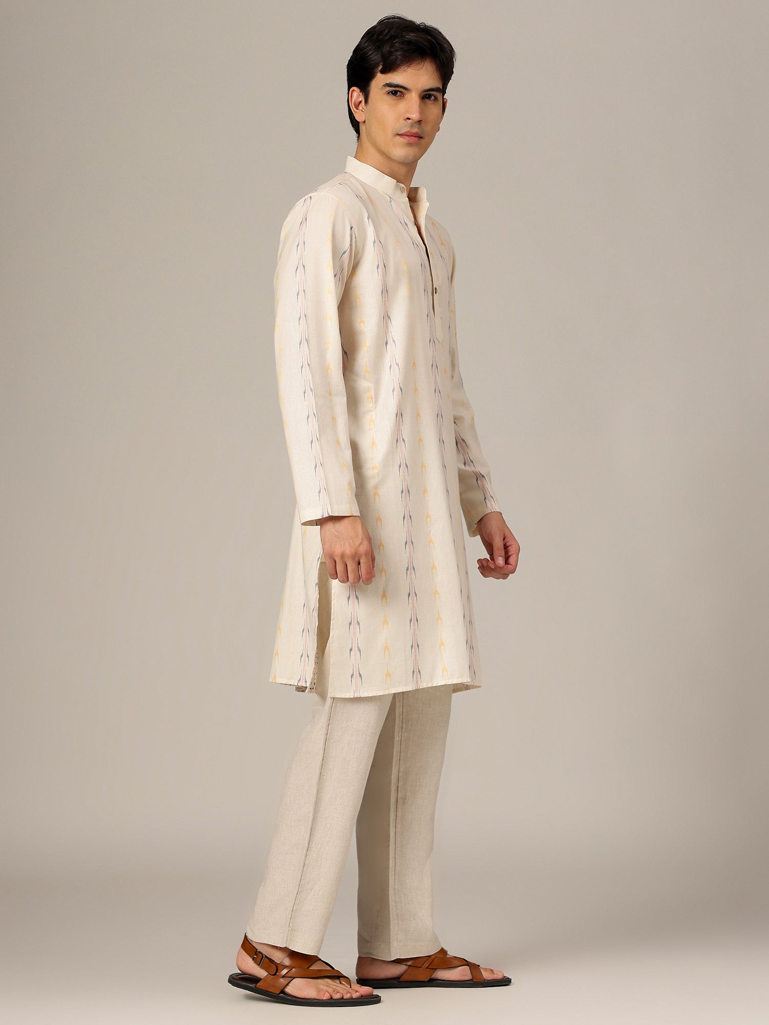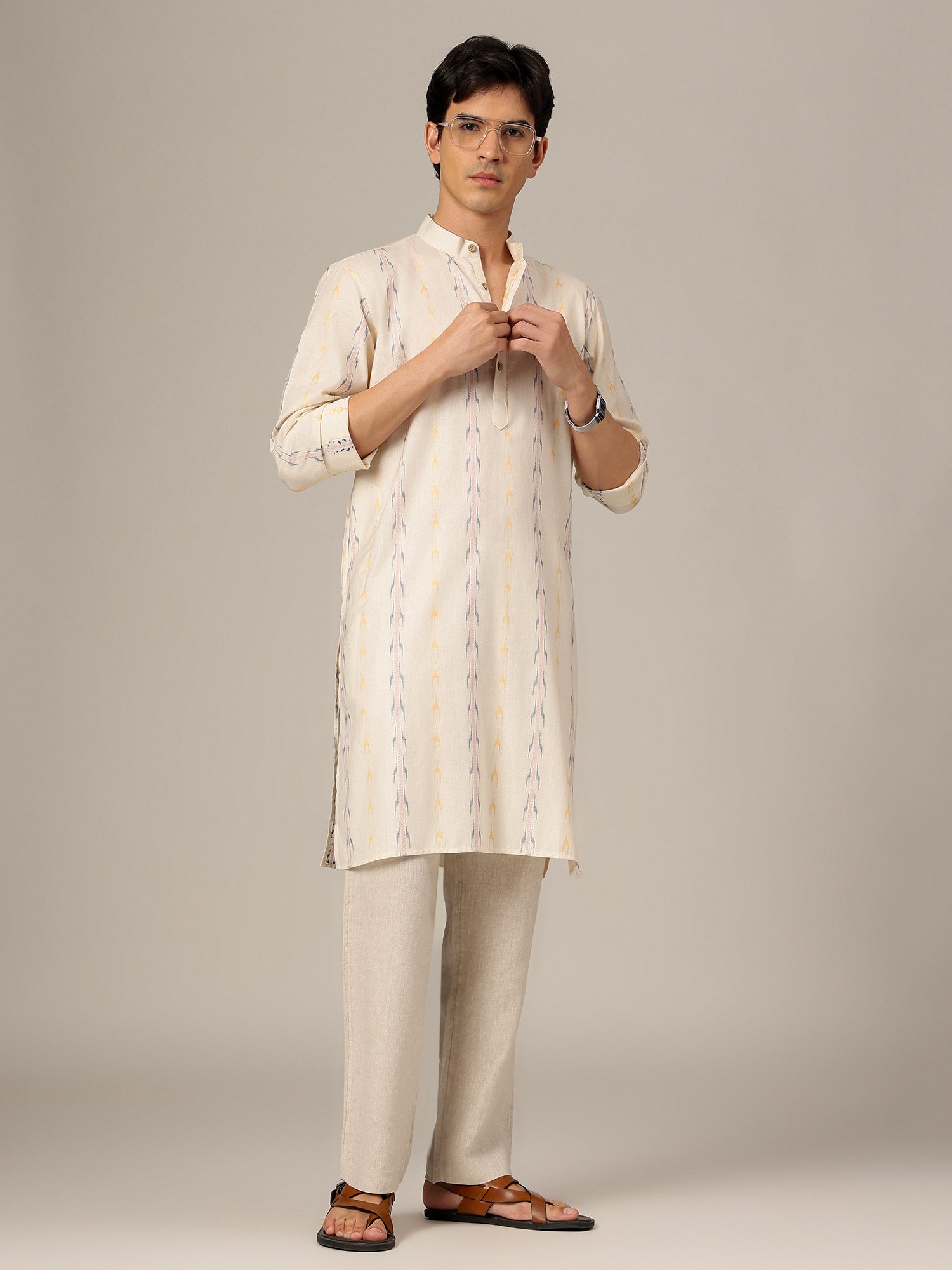 Showcasing a timeless Ikat print, this cotton kurta offers a perfect mix of tradition and modern elegance. The Mandarin collar and straight silhouette enhance its sophisticated appeal.