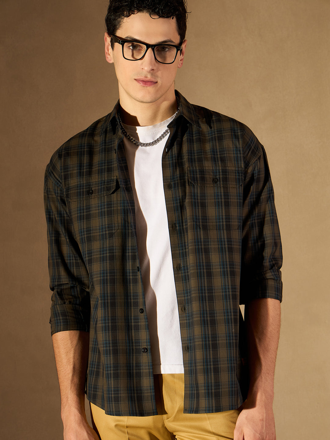 Olive green tartan checked opaque casual shirt ,has a spread collar, button placket, 2 flap pocket, long regular sleeves, curved hem