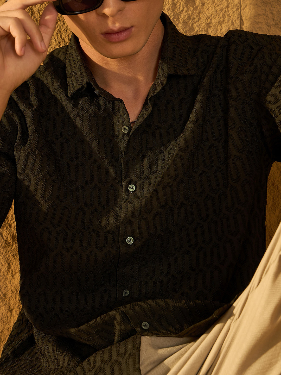 Olive Green Drop Shoulder Oversized opaque casual Textured, Self design shirt ,has a Spread collar, no pocket, button placket, Polyester Fabric, Half regular sleeves, Curved hem