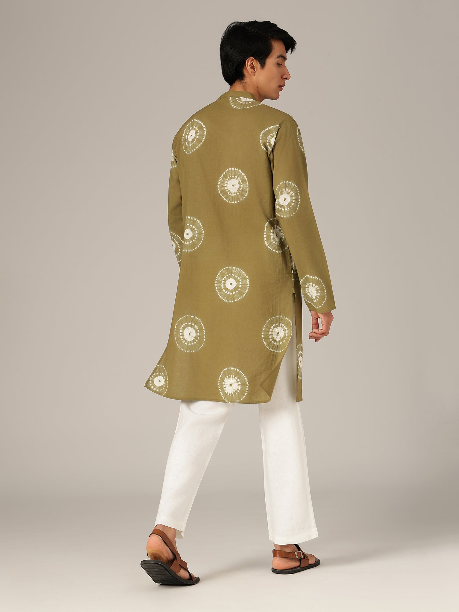 This Regular Fit Bandhani Printed Kurta is crafted from sustainable cotton, featuring a Mandarin Collar, long sleeves, side slits, and a straight hemline. Knee-length design in earthy tones offers comfort, style, and eco-friendly elegance.