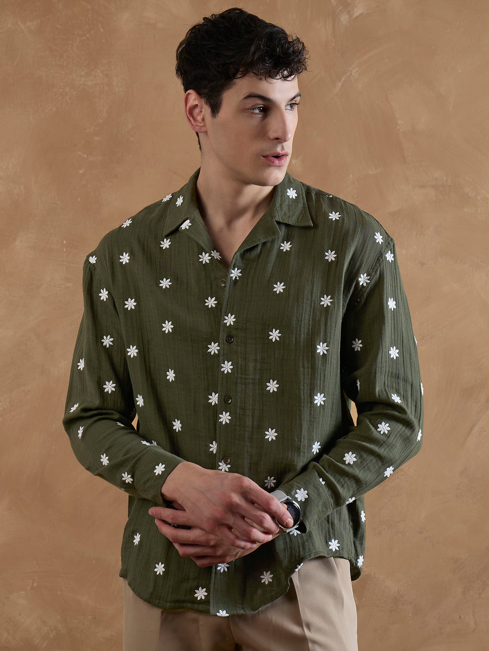Olive:Full Sleeves Muslin Embroidered Shirt