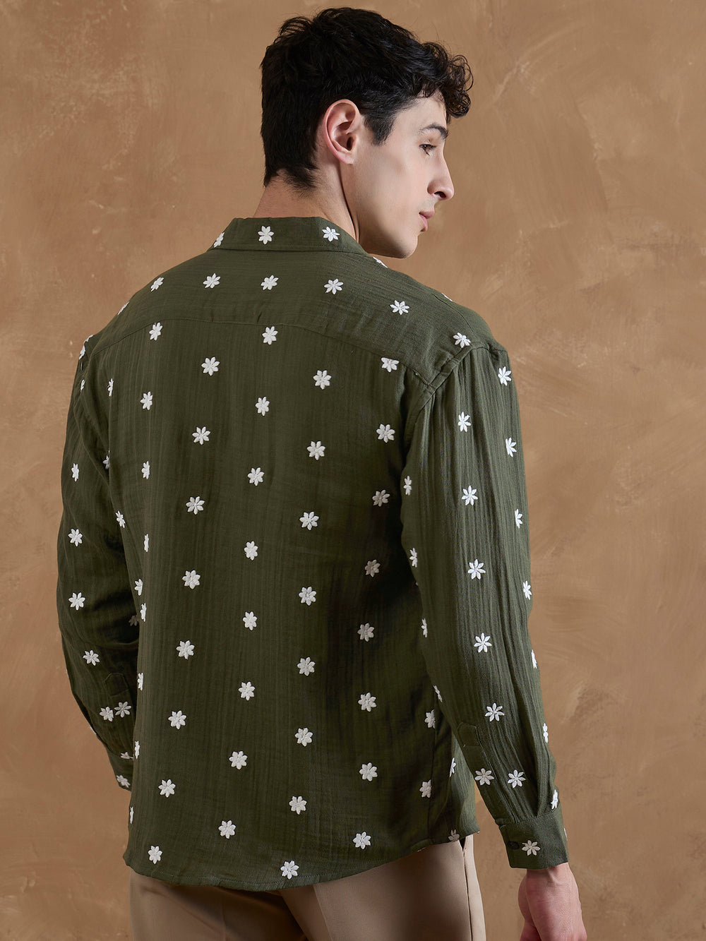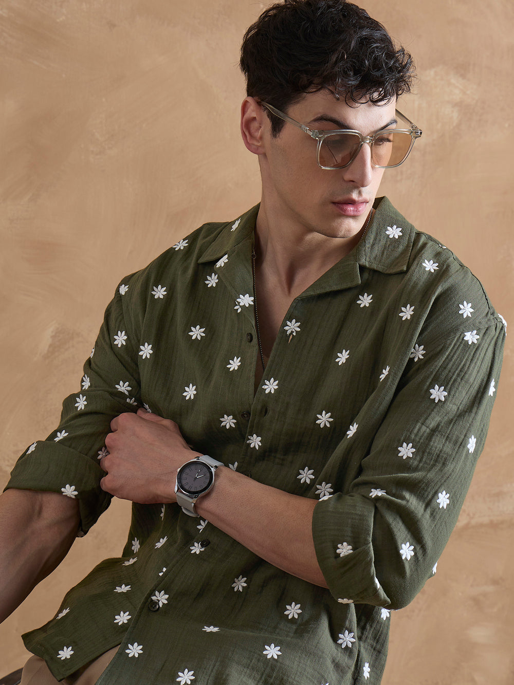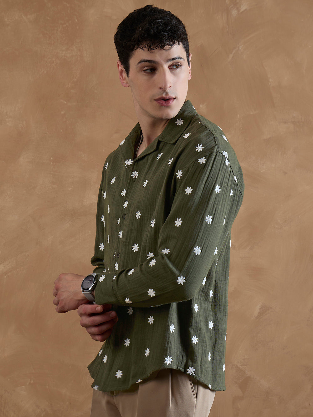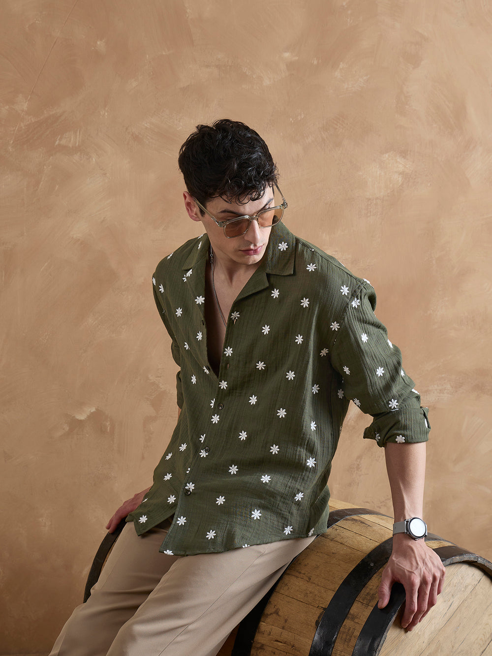 Crafted from breathable double gauge muslin, this relaxed fit Dennison shirt features a Cuban collar, drop shoulders, full sleeves, and a curved hemline—perfect for effortless, relaxed style.