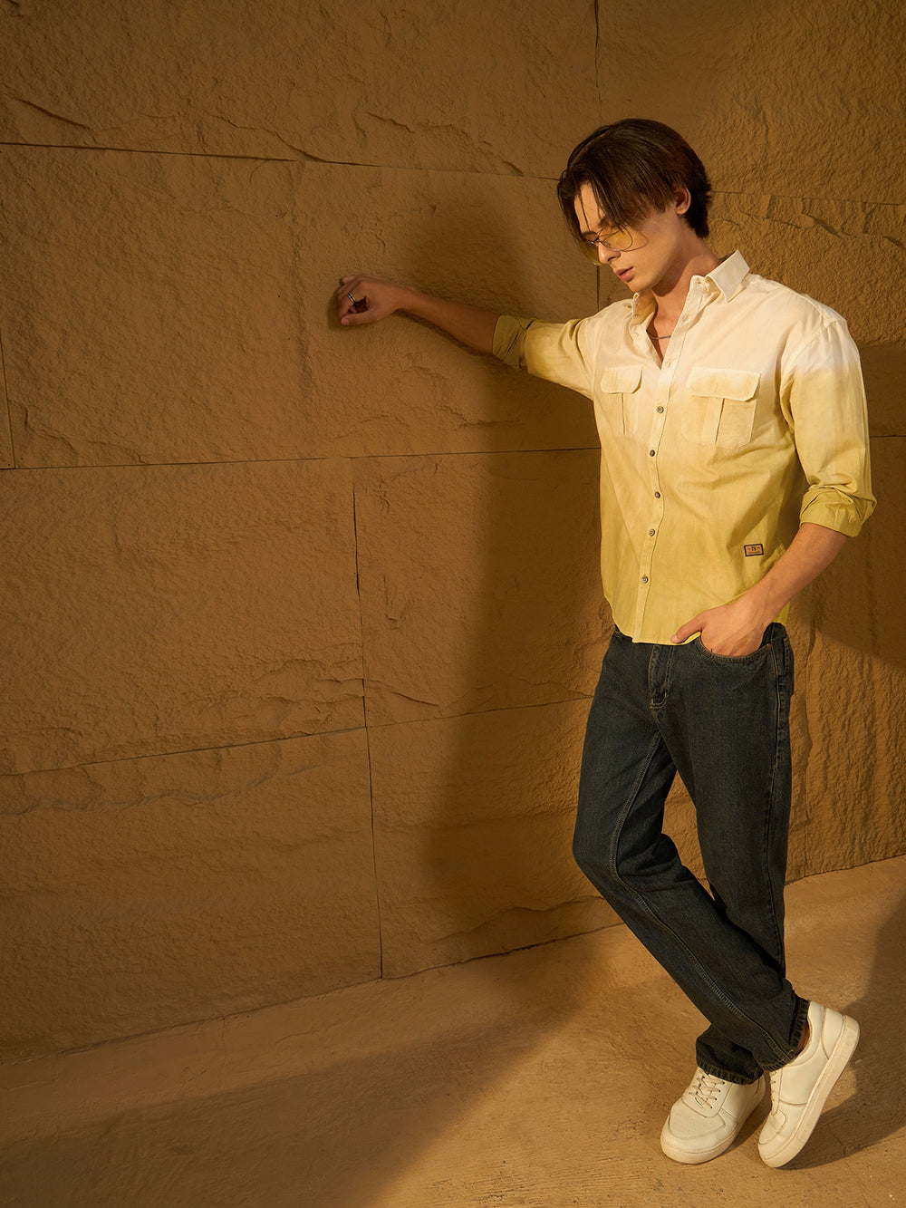 Olive Ombre effect opaque Casual shirt ,has a Spread collar, button placket, Double pocket, Long regular sleeves, curved hem