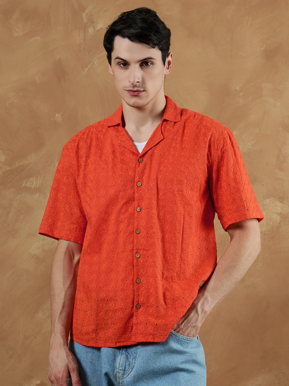 Stay effortlessly cool in this Oversize Fit Schiffli Shirt crafted from breathable cotton. Featuring embroidered detailing, a Cuban collar, drop-shoulder, half sleeves, and a semi sheer finish for laid-back casual vibes.