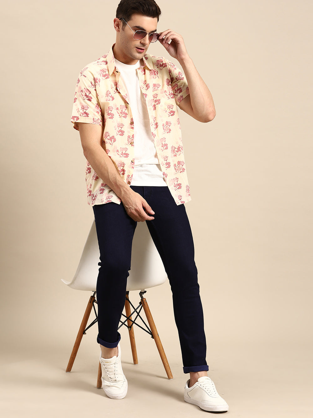 Peach-coloured floral printed opaque Casual shirt ,has a spread collar, button placket, 1 patch pocket, short regular sleeves, curved hem