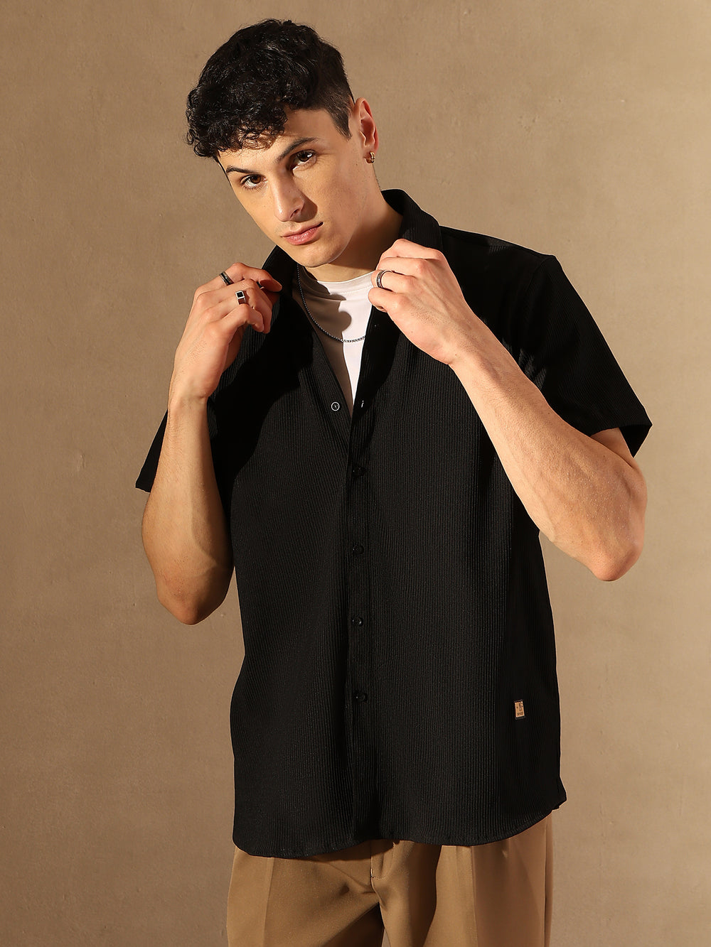 Black textured self design opaque Casual shirt ,has a spread collar, button placket, short regular sleeves, curved hem