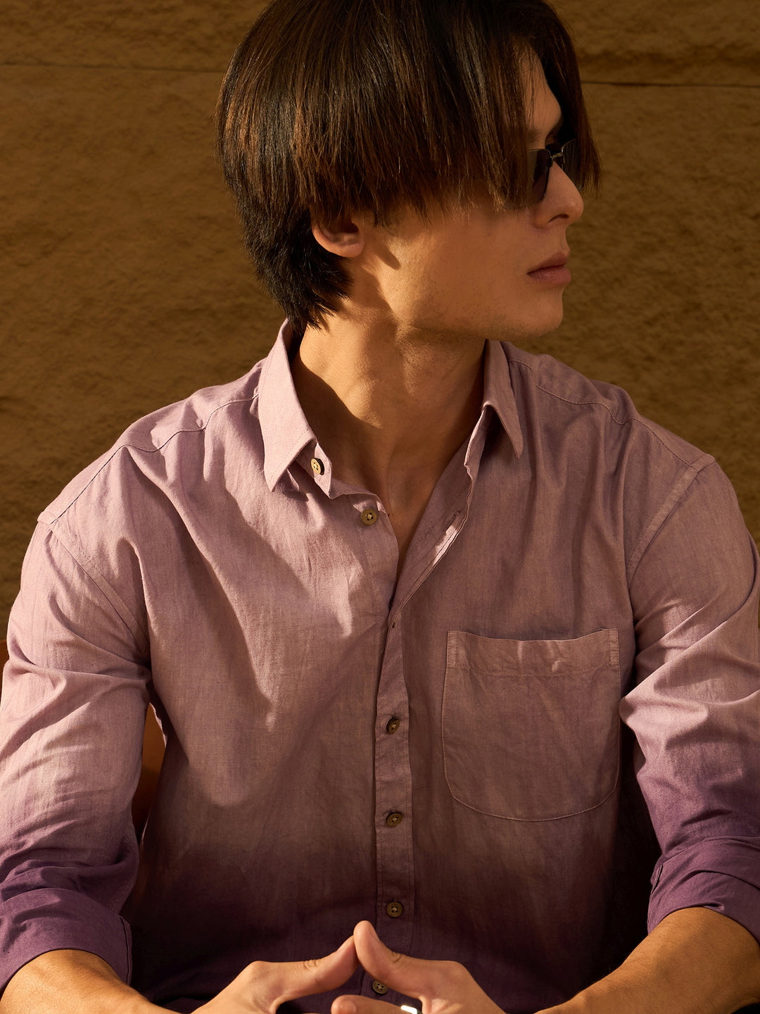 Purple Ombre effect Oversized opaque Shirt, has a Spread collar, button placket, 1 Pocket, Full regular sleeves, Curved hem, Drop Shoulder
