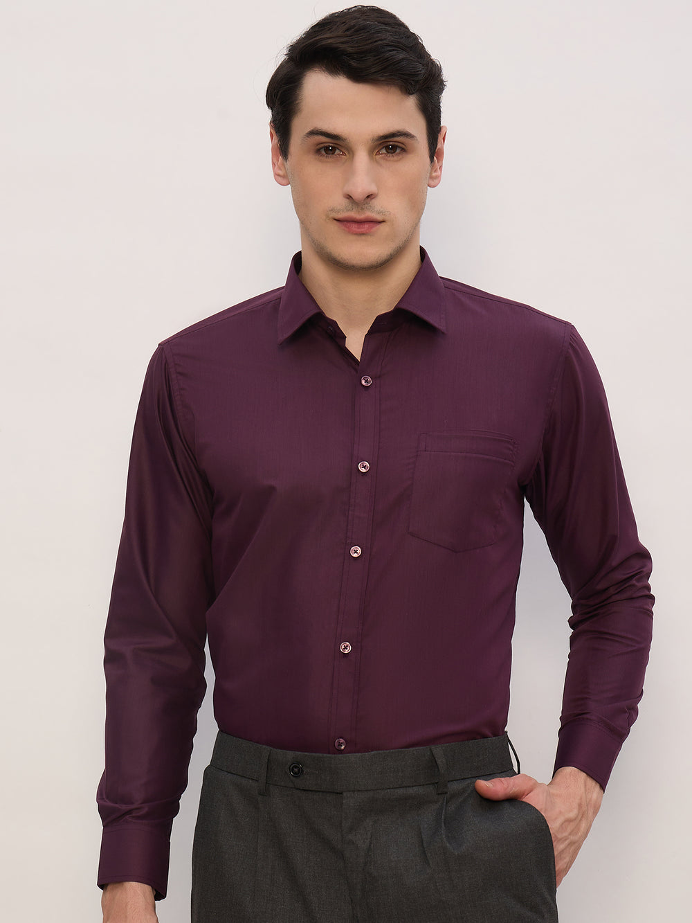 Wine Colored opaque formal shirt for men Spread collar Button placket Patch pocket Straight hemline Solid Regular length Long sleeves