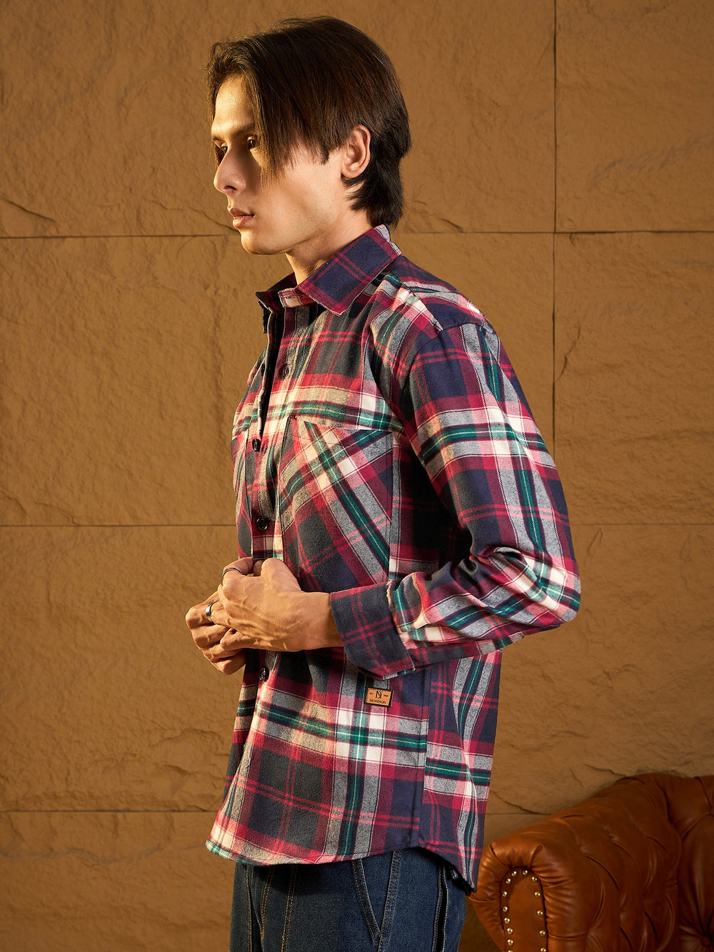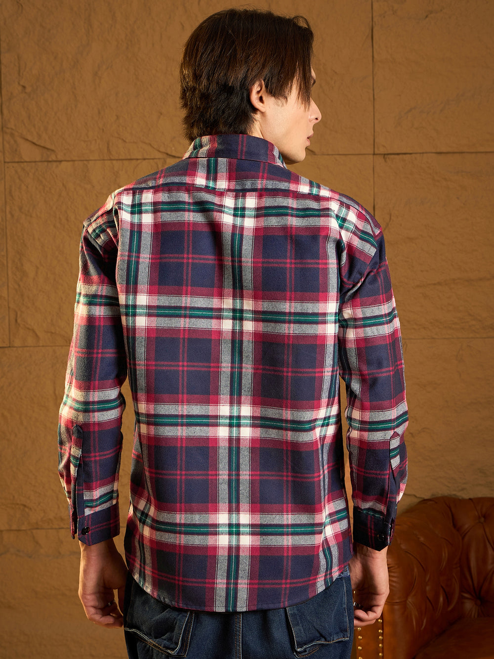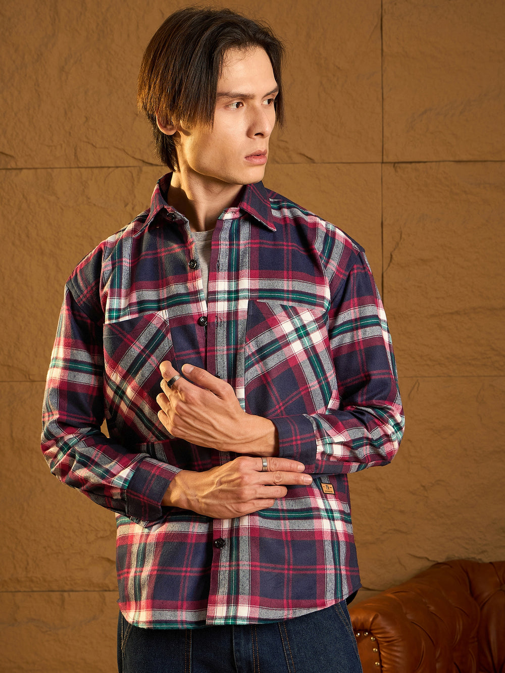 A cozy, versatile oversized shacket crafted from soft cotton with a double-pocket design and dropped shoulders for a relaxed fit. The full sleeves and timeless check pattern add casual-chic appeal, perfect for layering any season.