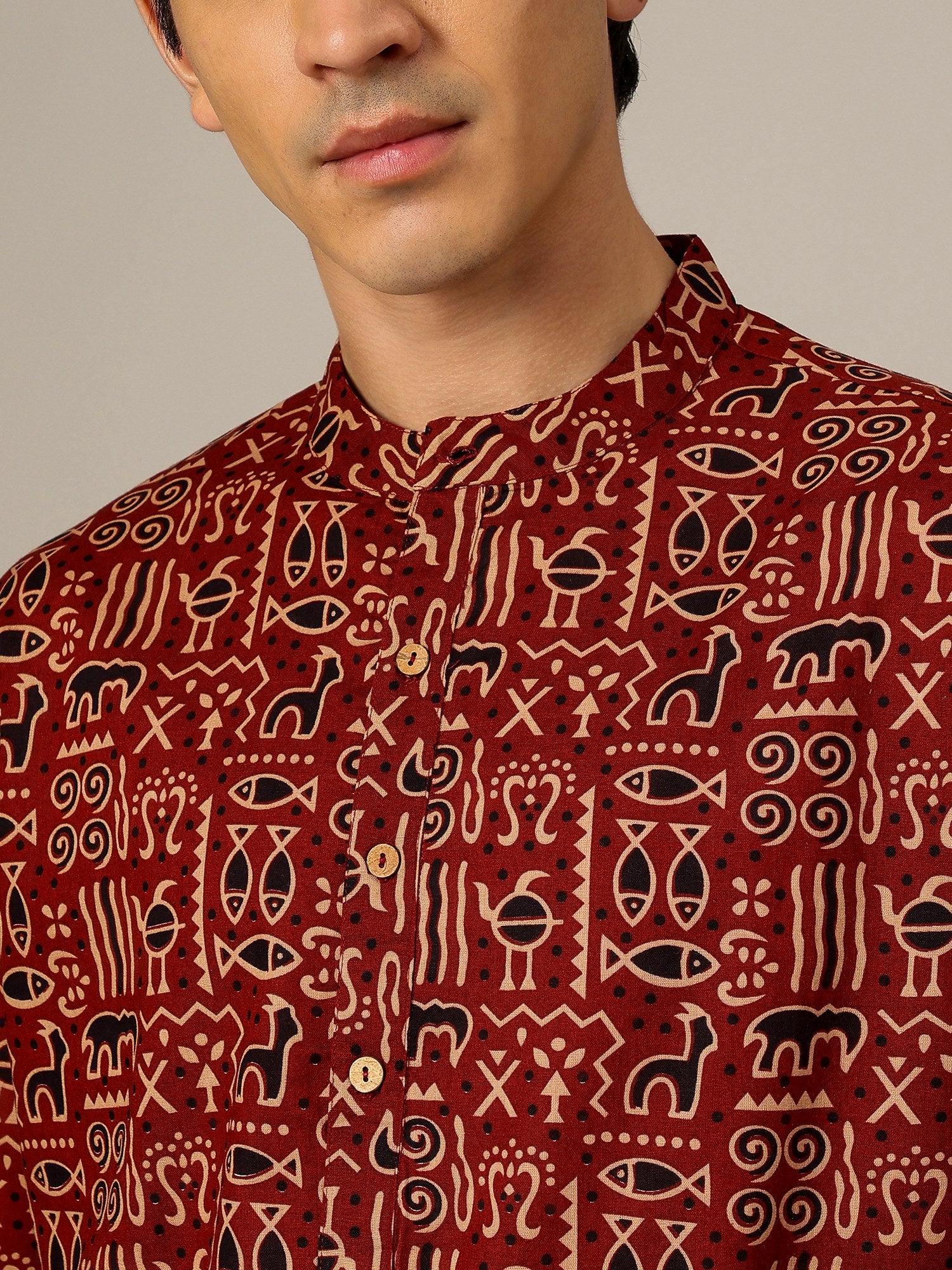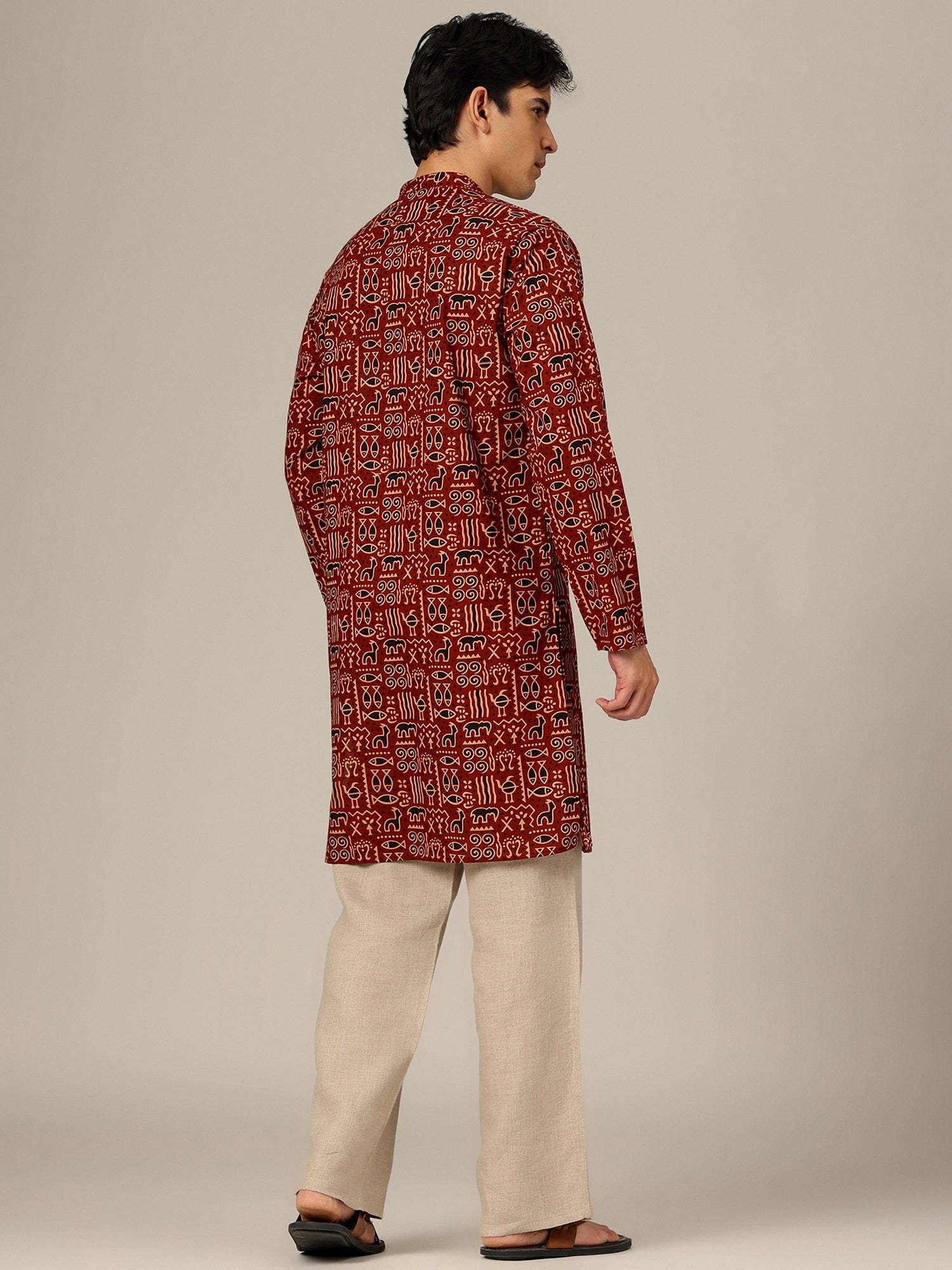 This Regular Fit Block Printed Kurta is crafted from soft cotton and features a Mandarin collar, long sleeves, and two pockets. The knee-length, straight shape with side slits ensures comfort and timeless elegance.