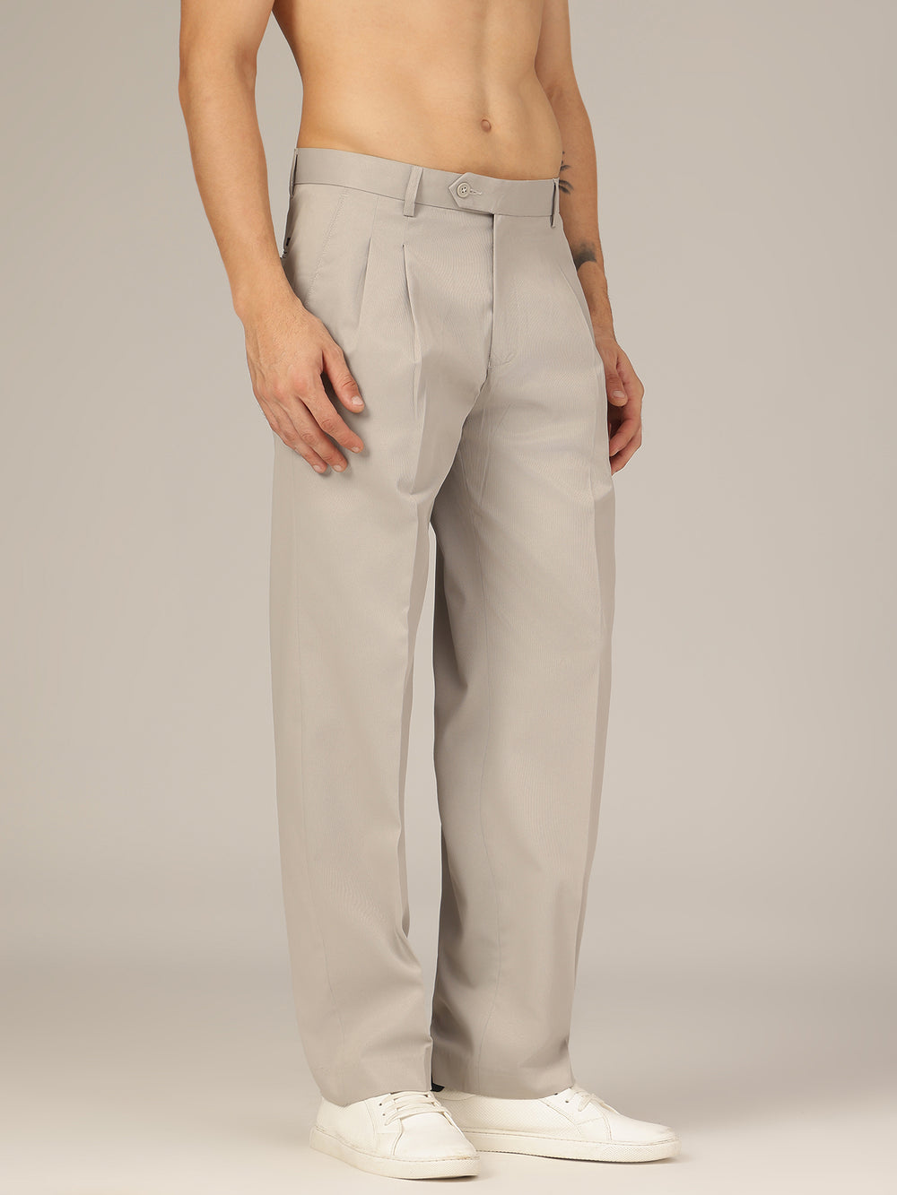 These Baggy Fit Korean Trousers are made from textured polyester, featuring a double pleated front, four functional pockets, and a button closure—offering effortless style and comfort for a casual, modern look.