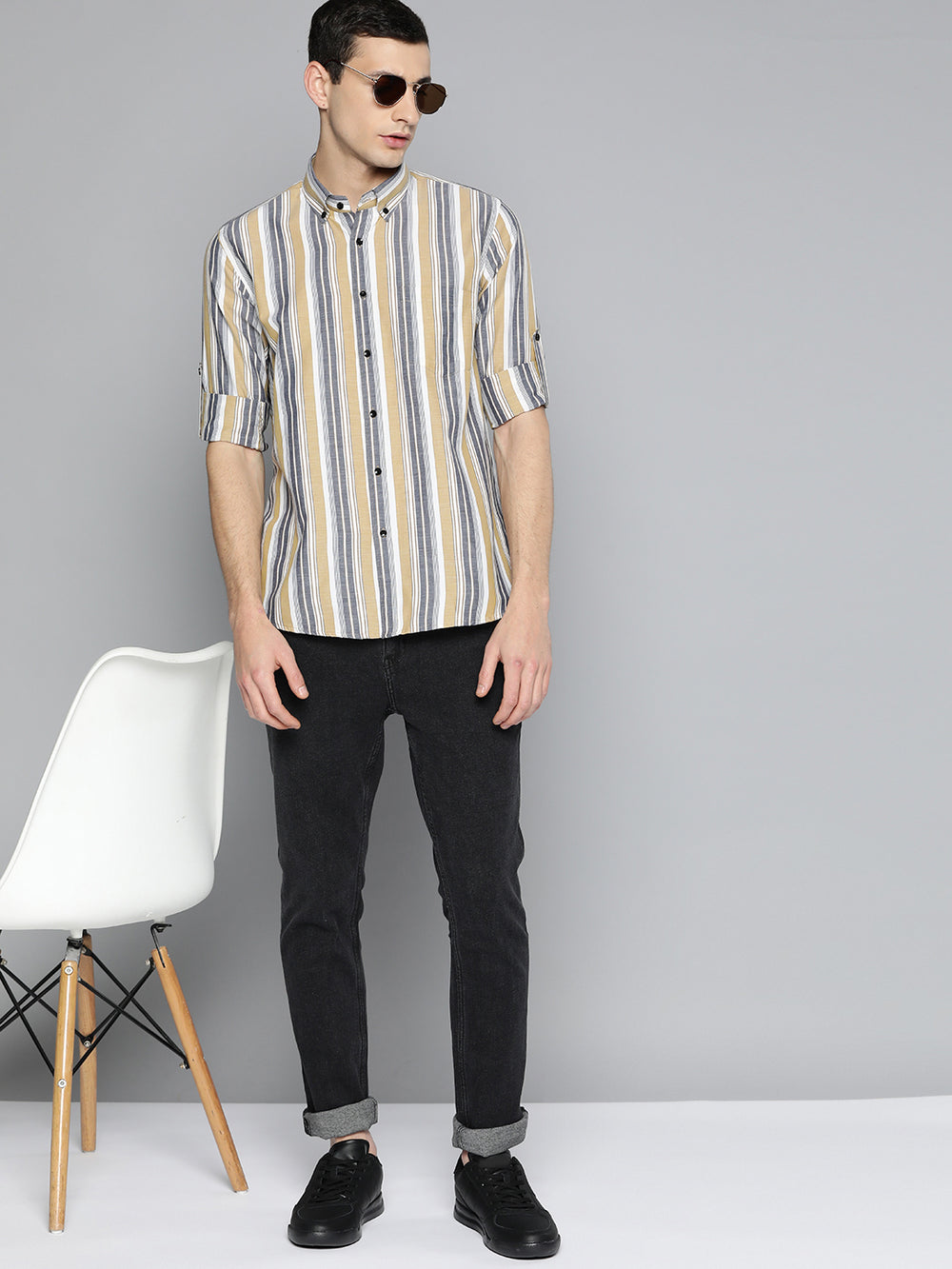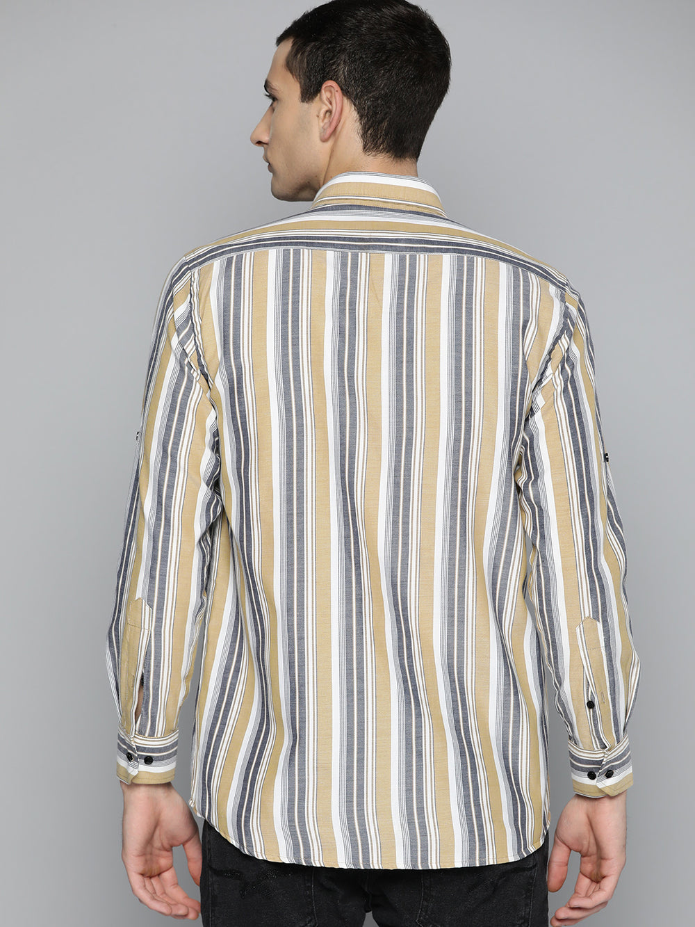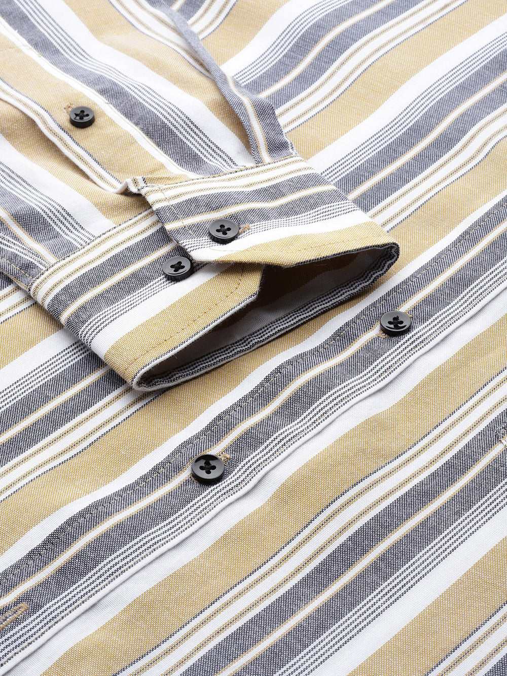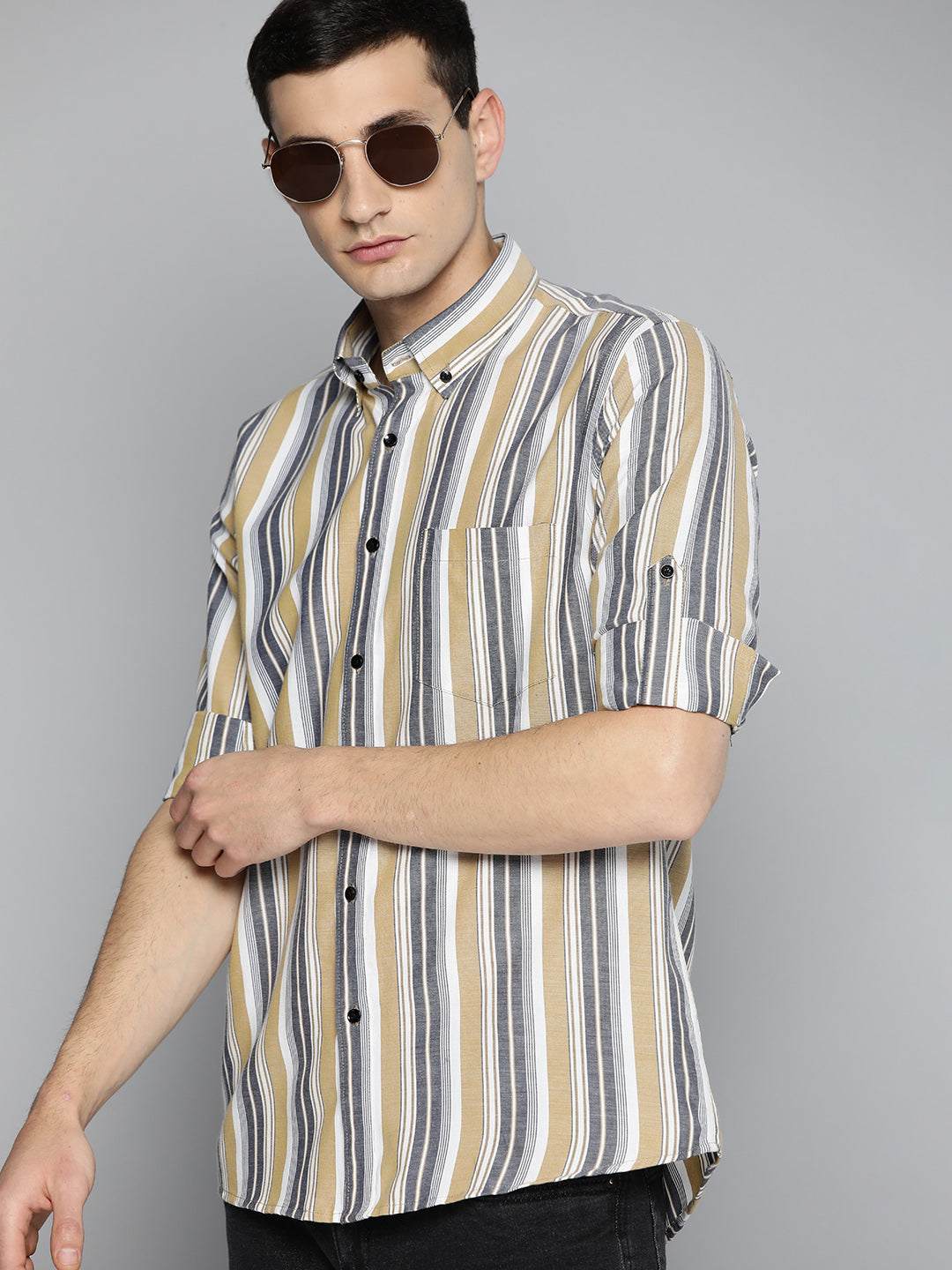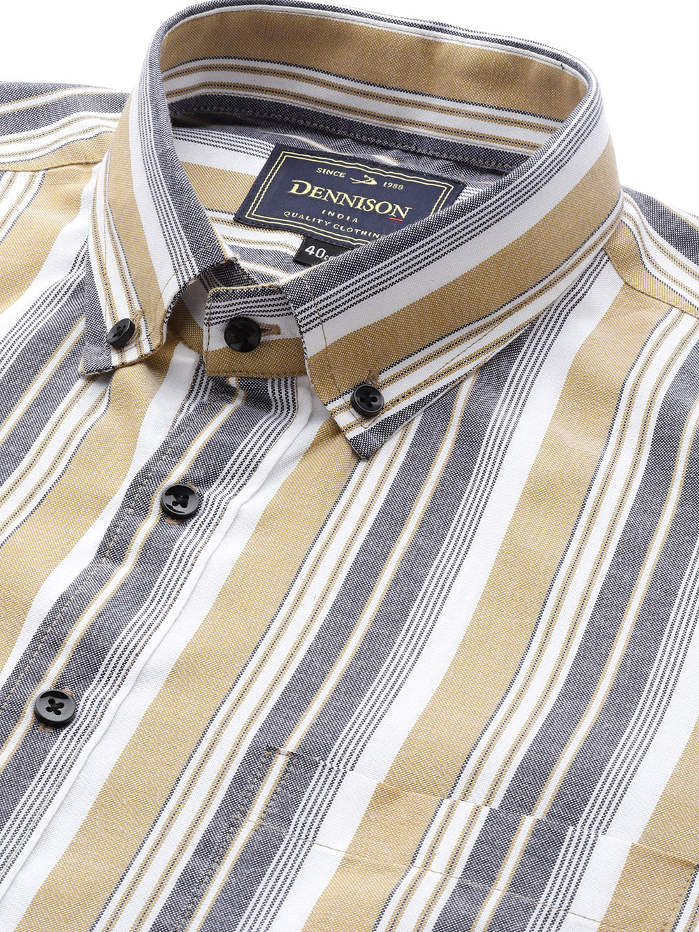 Mustard vertical stripes striped opaque Formal shirt ,has a button-down collar, button placket, 1 patch pocket, long roll-up sleeves, curved hem