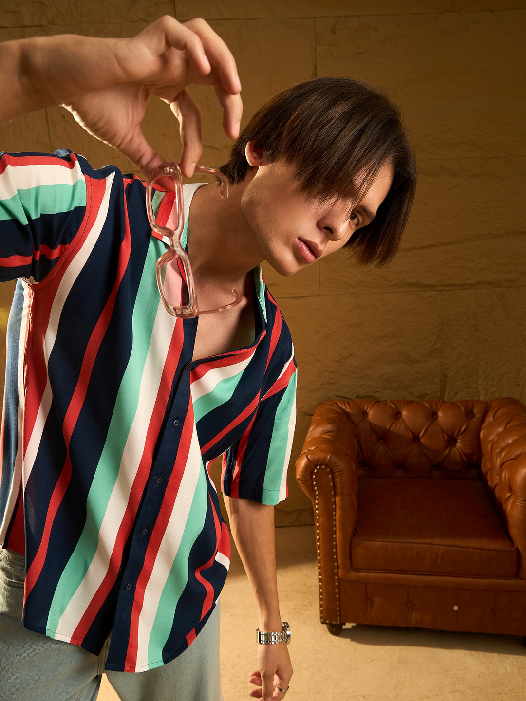 Elevate your casual wardrobe with this Men's Vertical Stripes Drop shoulder Oversized Shirt. Crafted from Viscose Rayon, it features a stylish Cuban collar and Half sleeves, making it perfect for laid-back outings. Regular length ensures versatile styling.