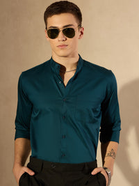 Black solid opaque Casual shirt has a mandarin collar, button placket, 1 patch pocket, long regular sleeves, curved hem