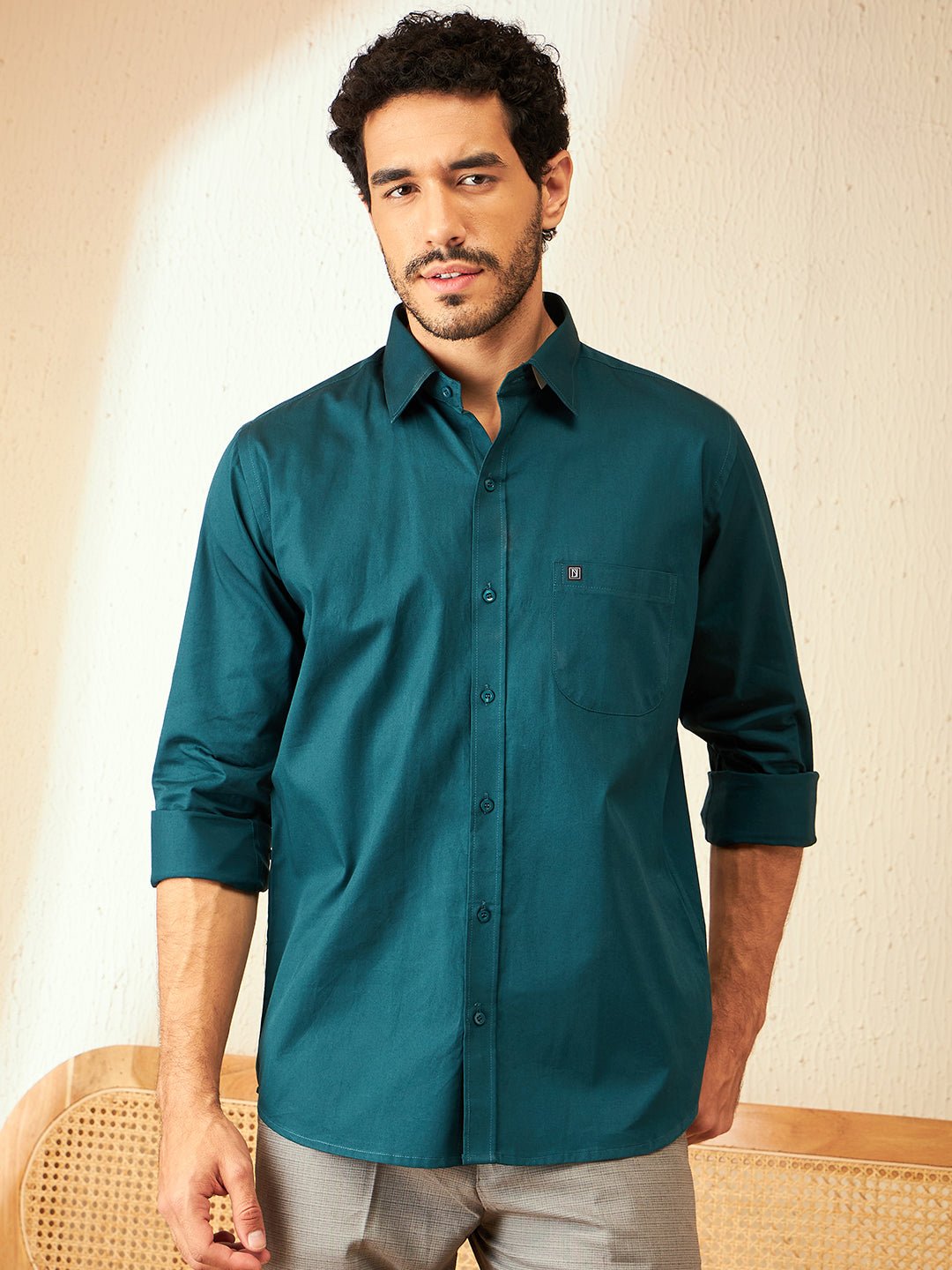Teal solid opaque Formal shirt ,has a spread collar, button placket, 1 patch pocket, long regular sleeves, curved hem