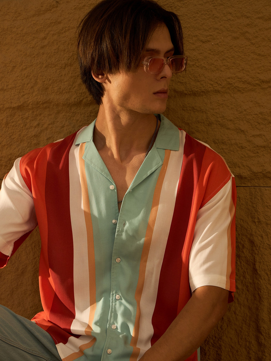Elevate your casual wardrobe with this Men's Vertical Stripes Drop shoulder Oversized Shirt. Crafted from Viscose Rayon, it features a stylish Cuban collar and Half sleeves, making it perfect for laid-back outings. Regular length ensures versatile styling.