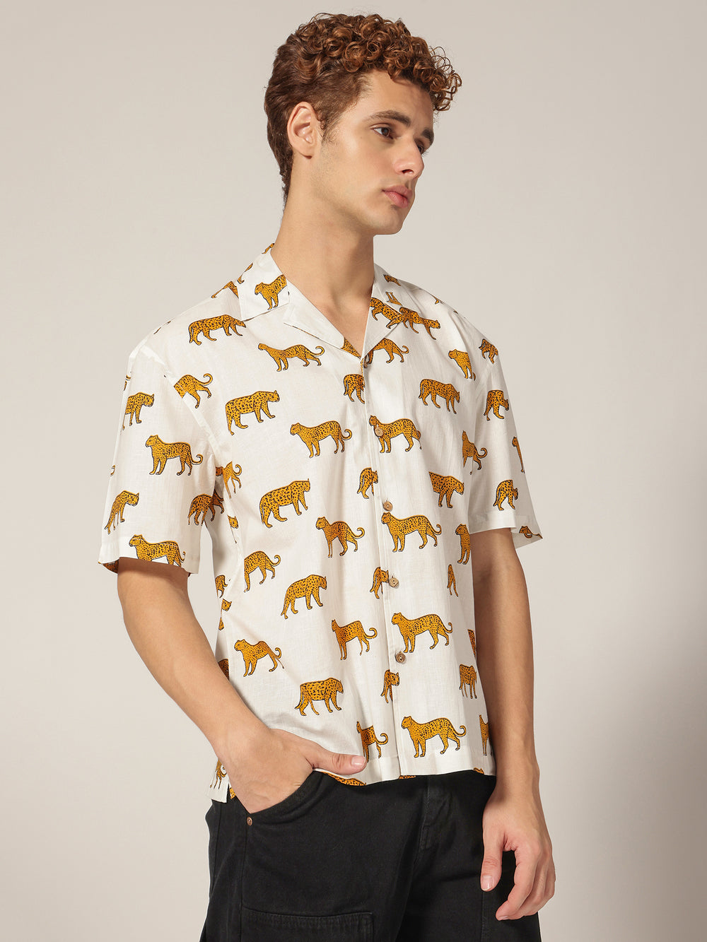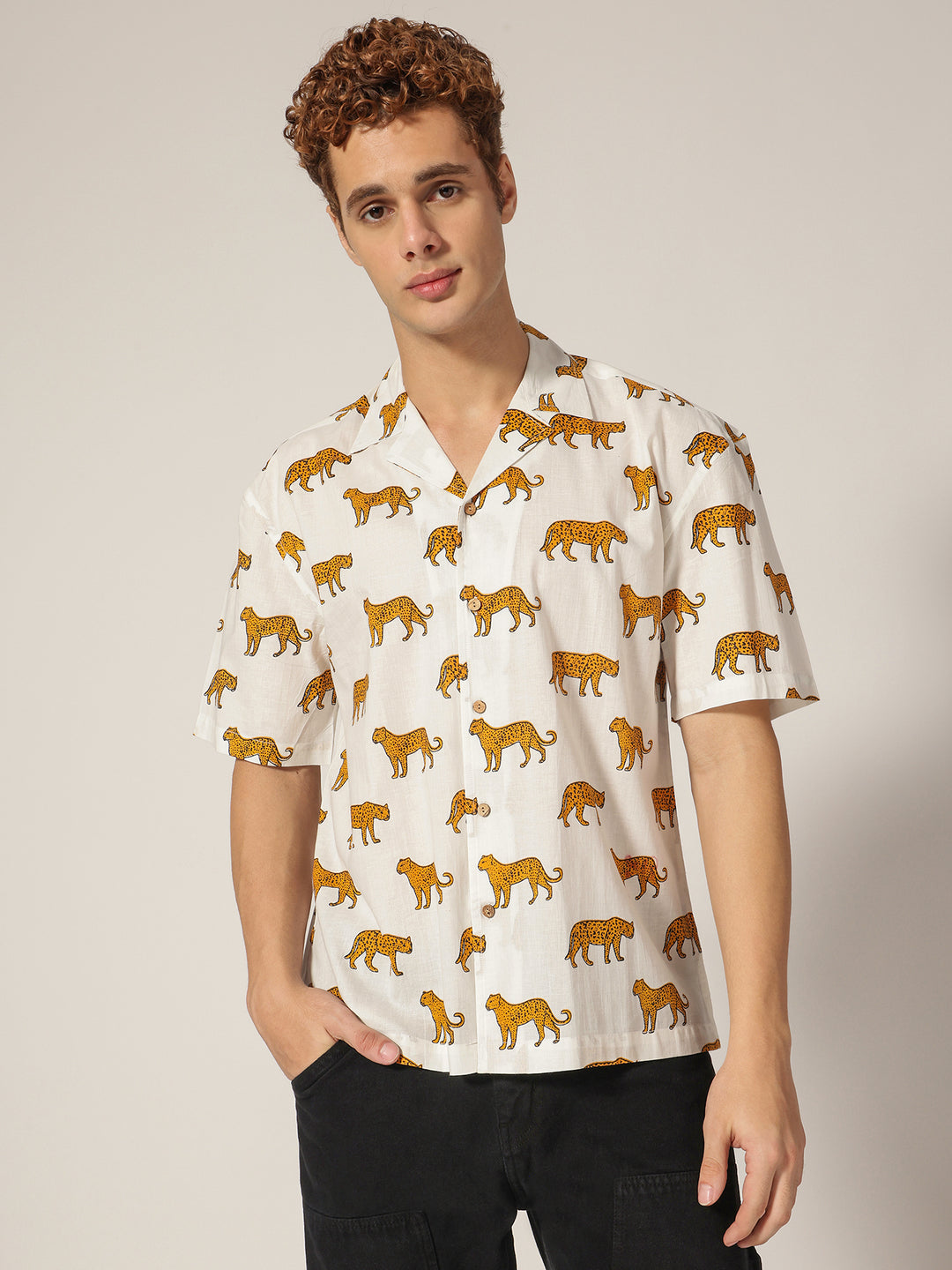 White & Step up your style game with this Oversized Fit Casual shirt in soft Cotton, featuring bold Animal Block Printed design, Drop Shoulder, Half Sleeves, Cuban Collar, Straight Hemline, and no pocket for a clean finish.