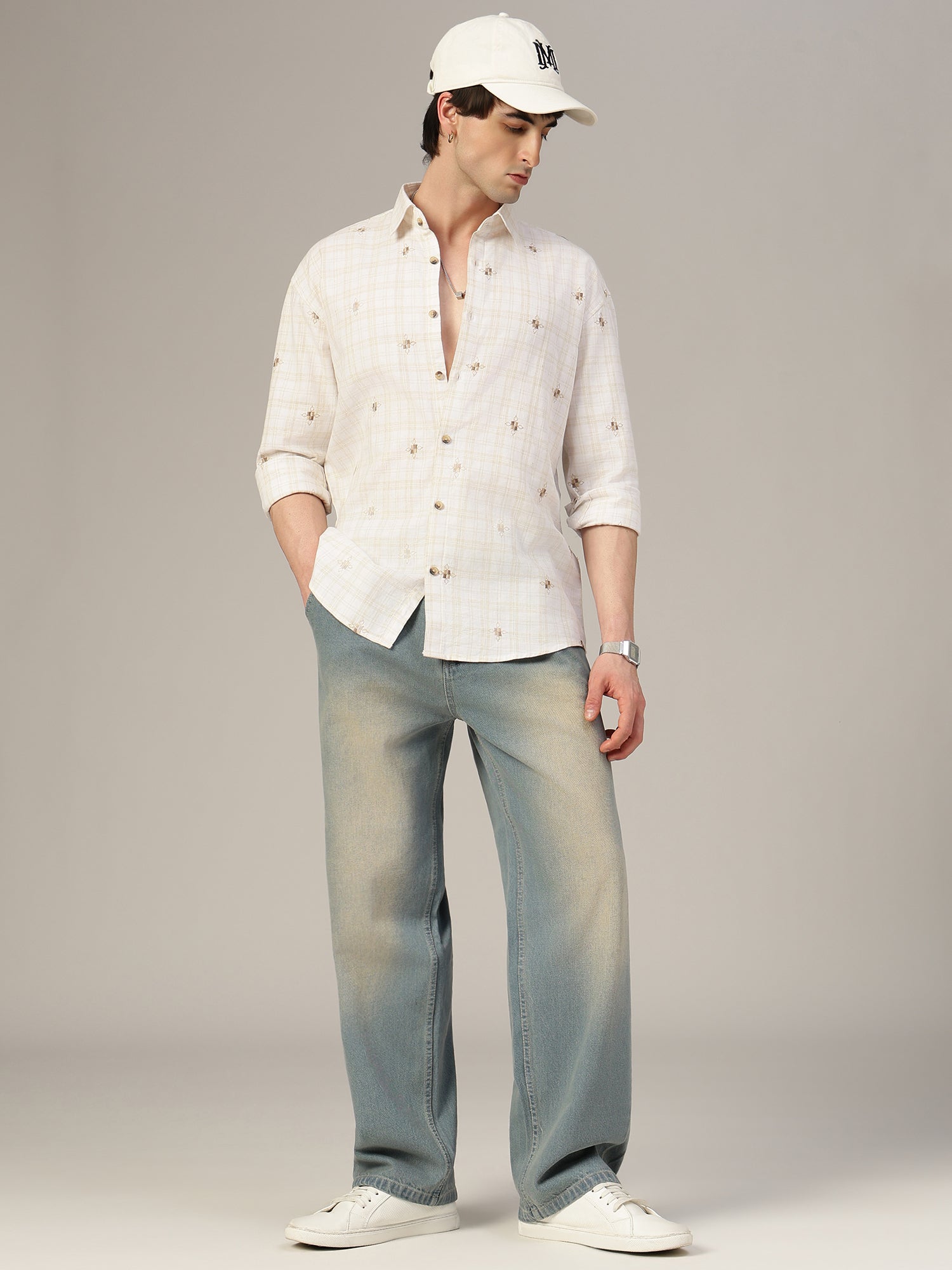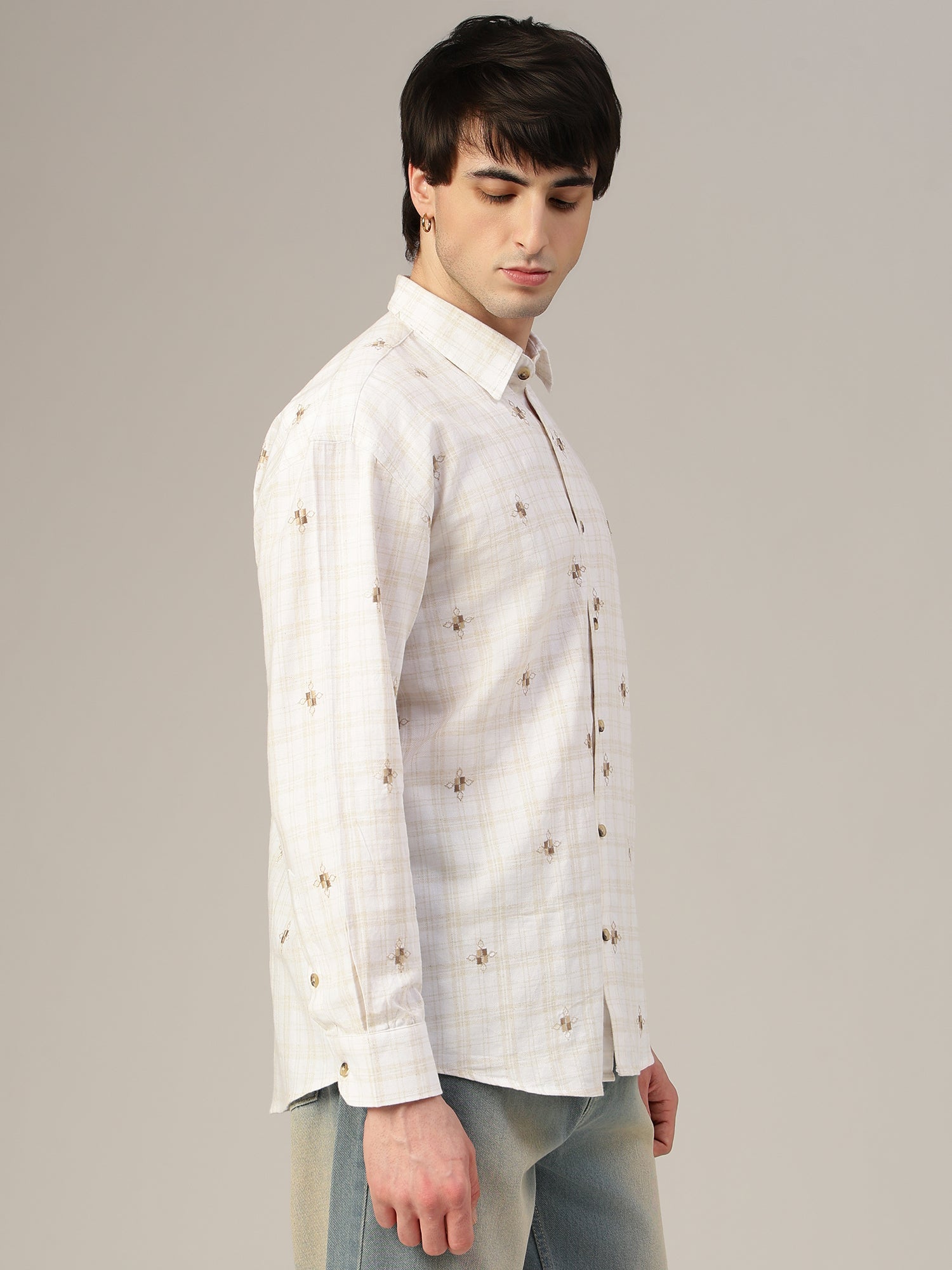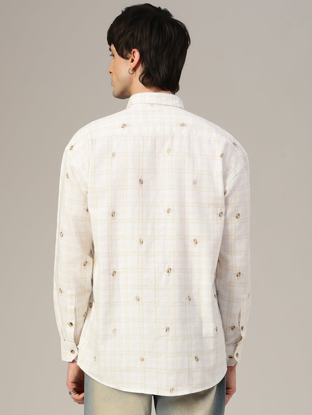 This Oversized Checkered Embroidered Shirt is a stylish Casual Shirt featuring a Spread Collar, Full Sleeves, and Drop-Shoulder design. Crafted from breathable Cotton Linen with a Curved Hemline, it offers comfort with a refined touch.