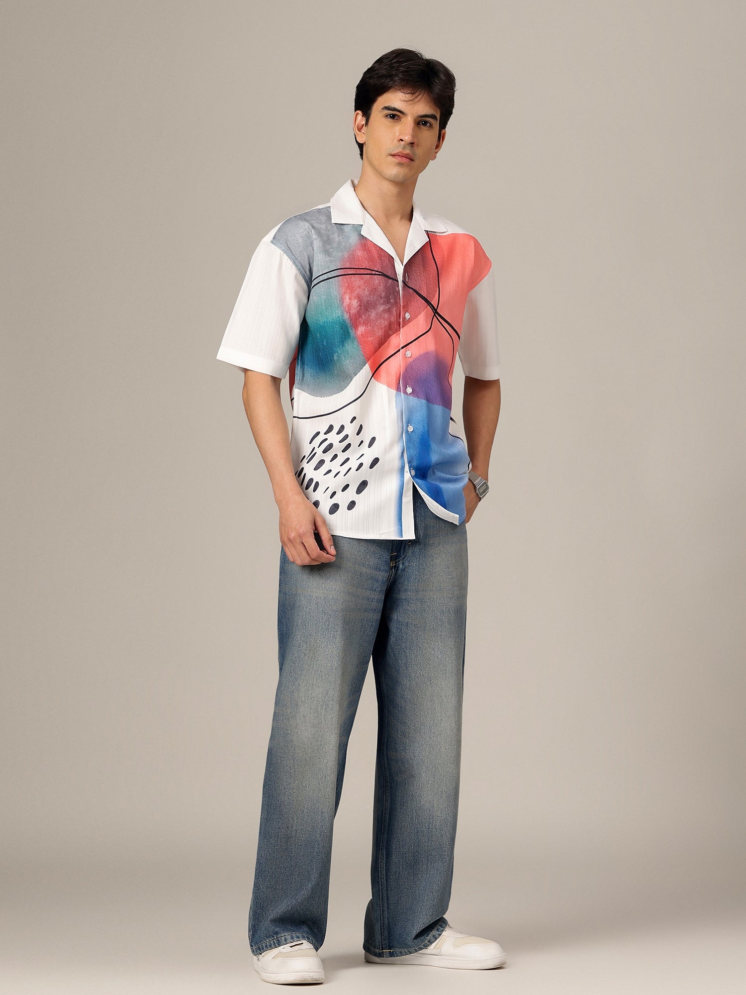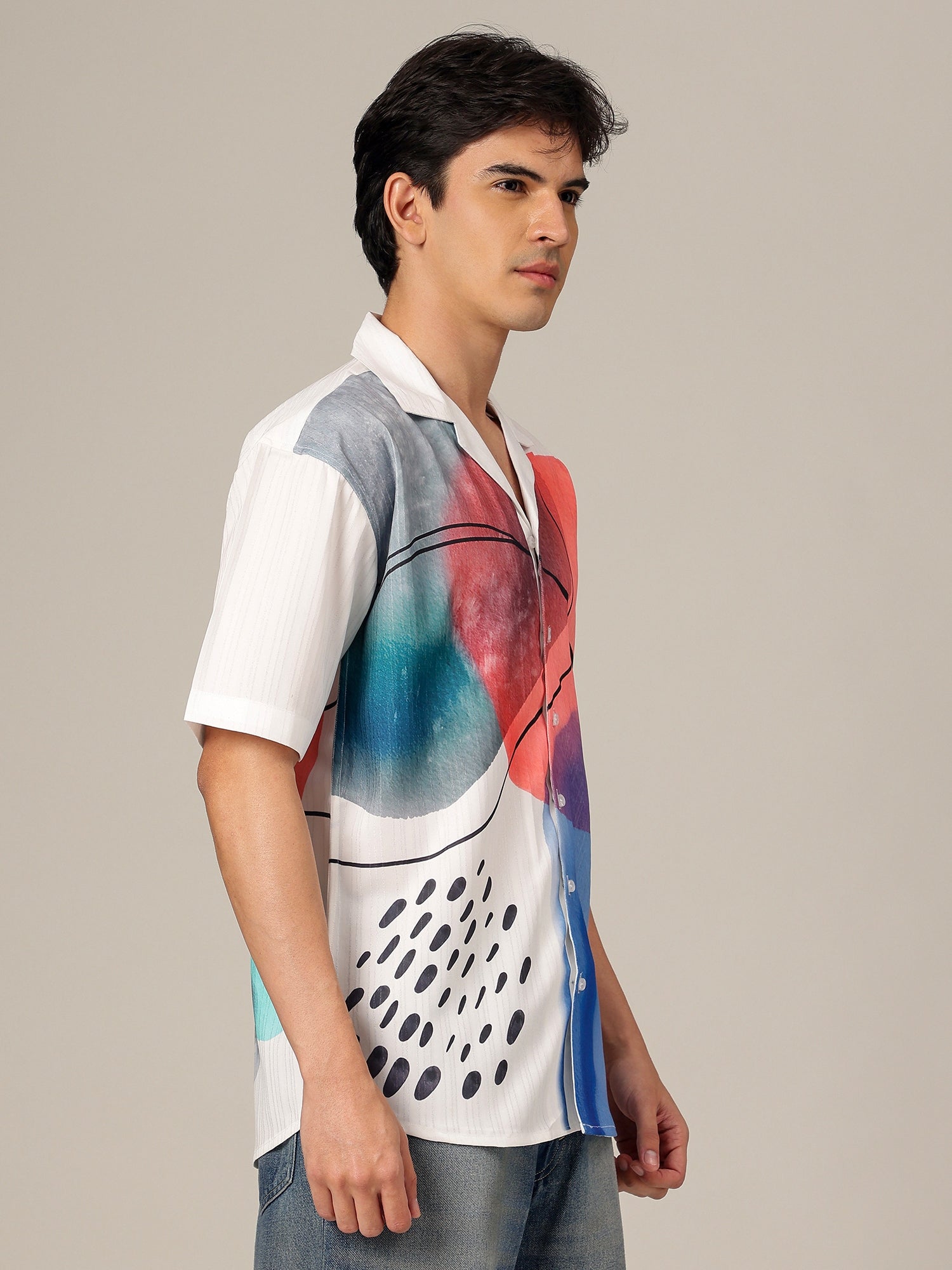 This Textured Placement Printed Casual Shirt combines bold design with relaxed comfort. Its oversized fit and Cuban collar create a chic, effortless look for casual style enthusiasts.