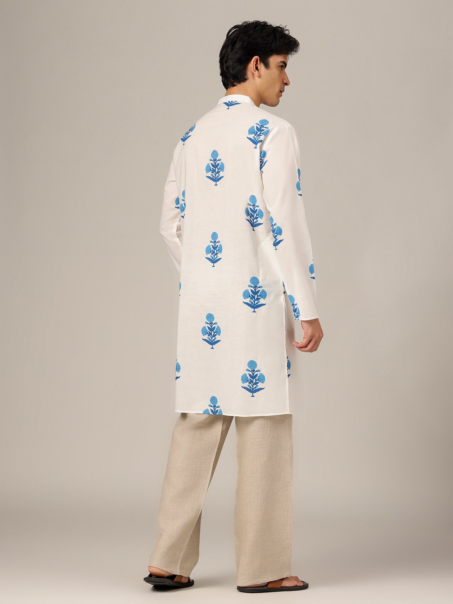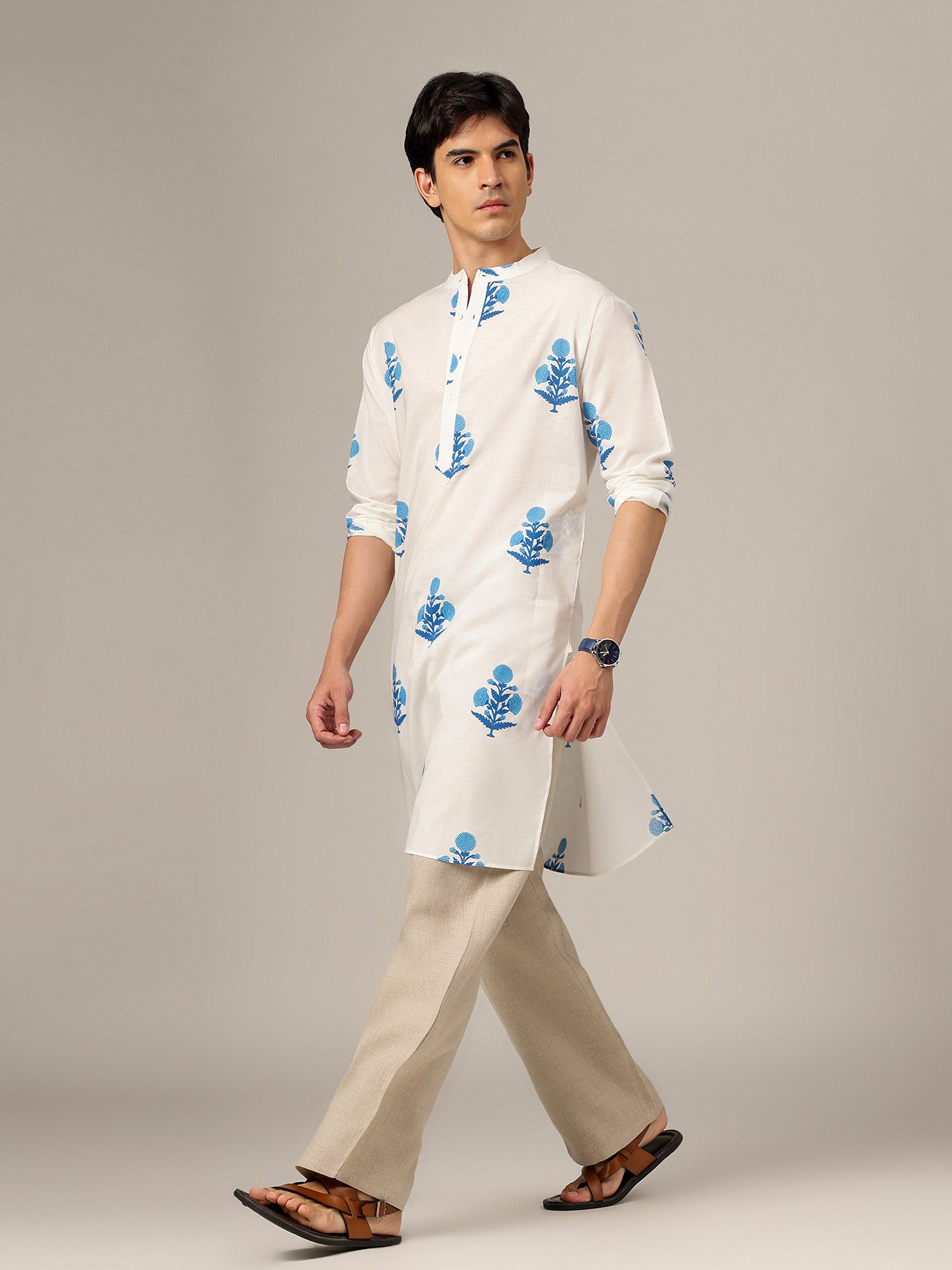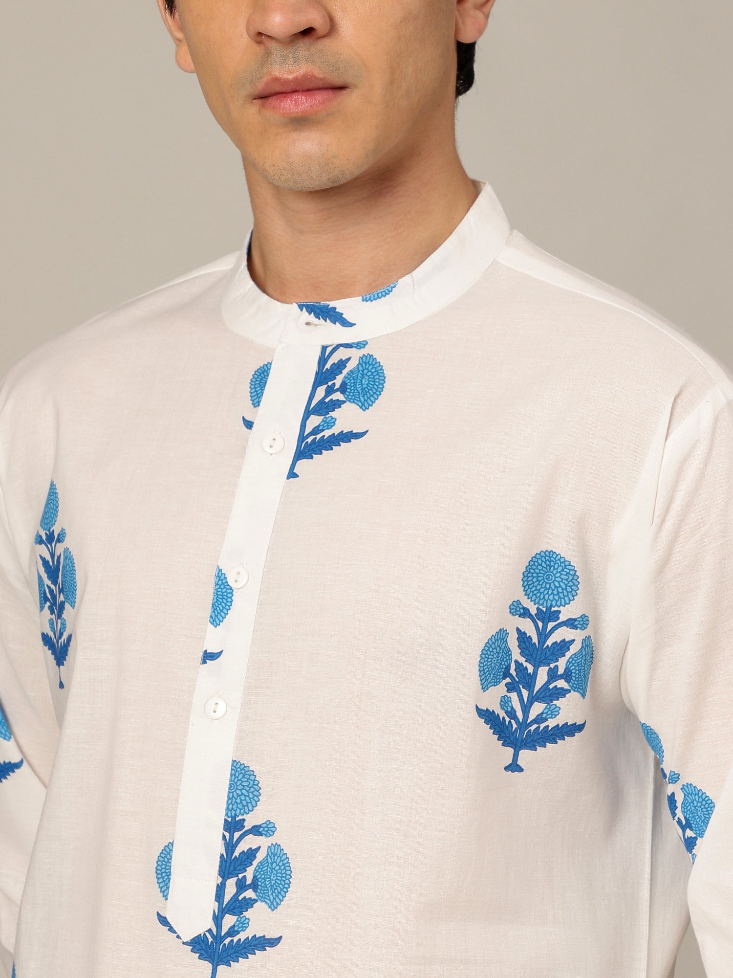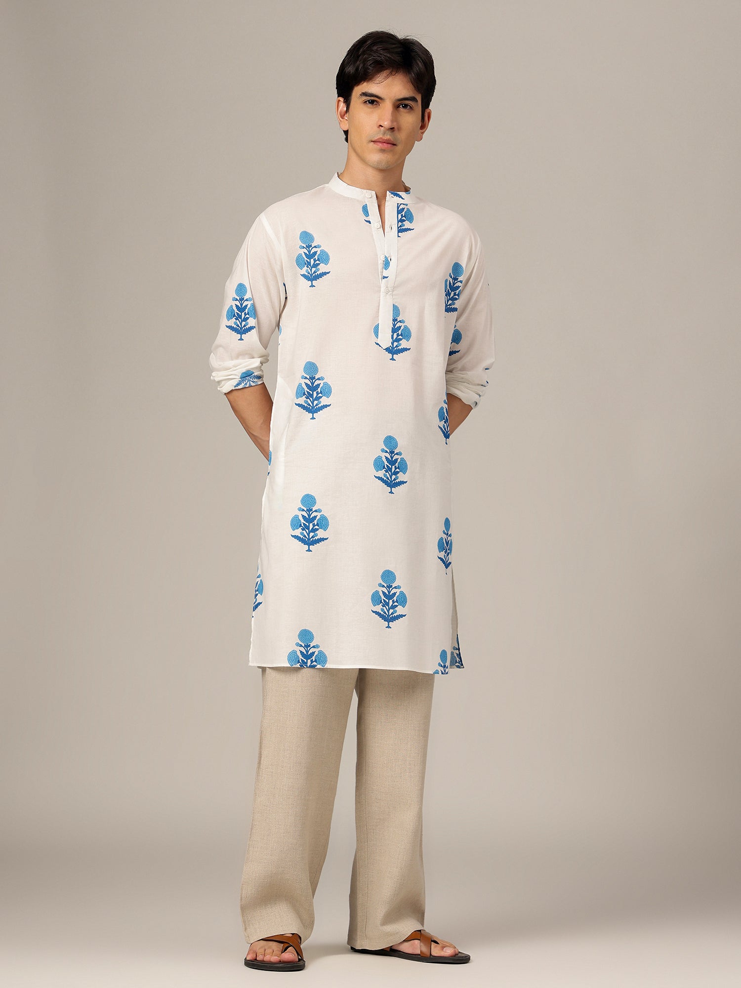White & Blue: Floral Block Printed Mandarin Collar Kurta