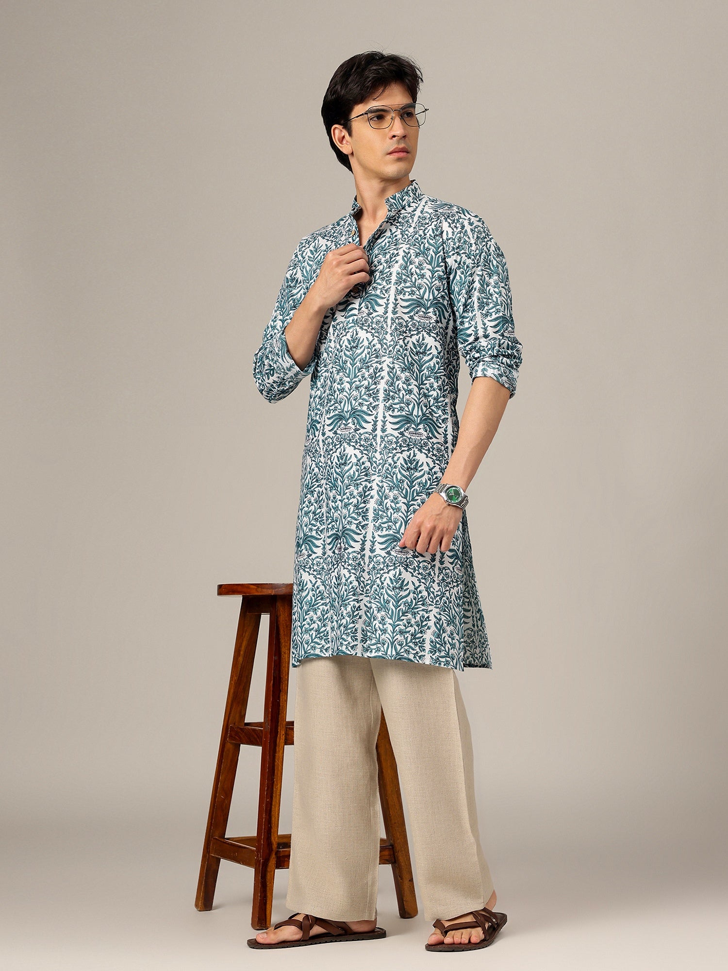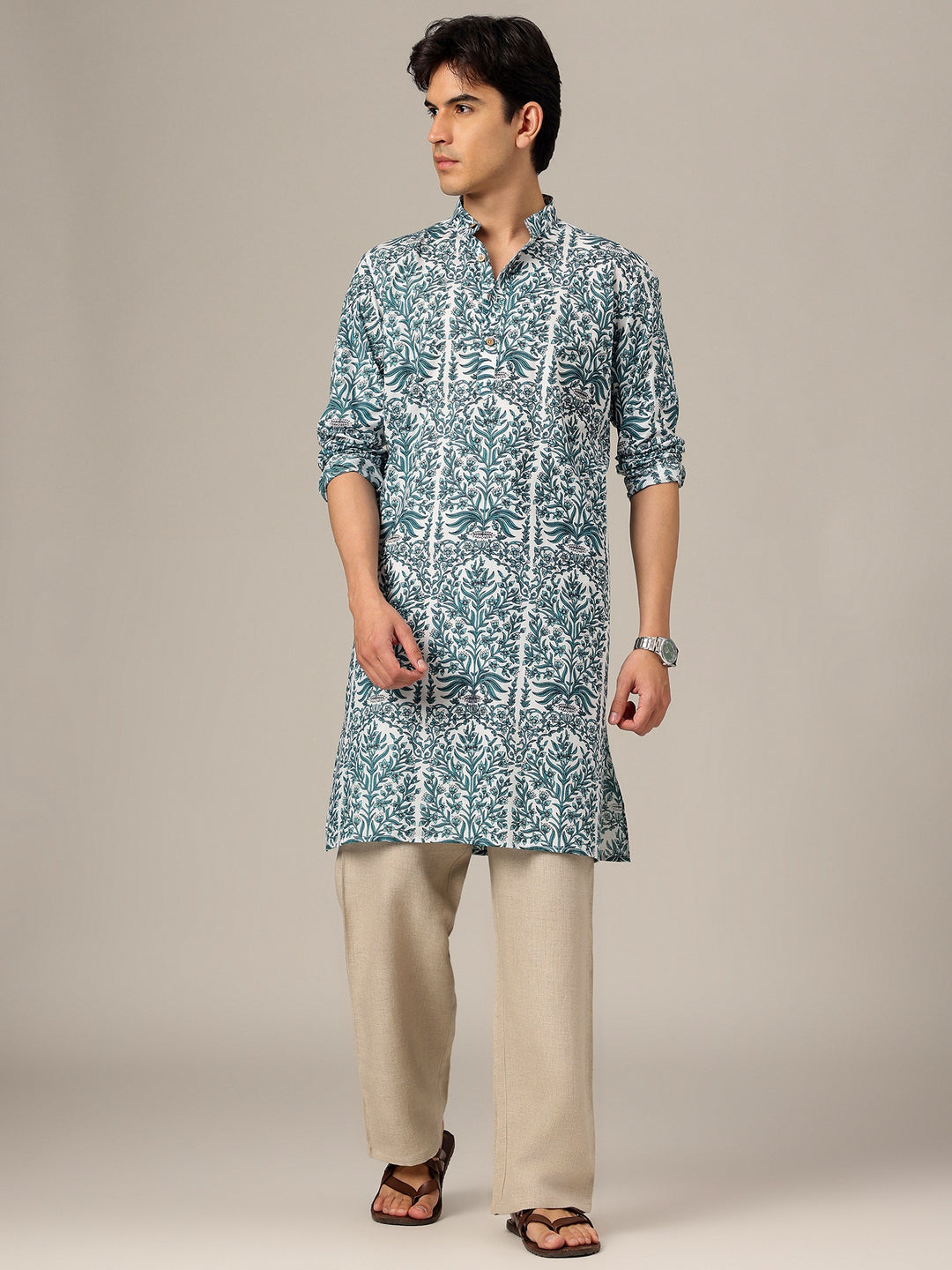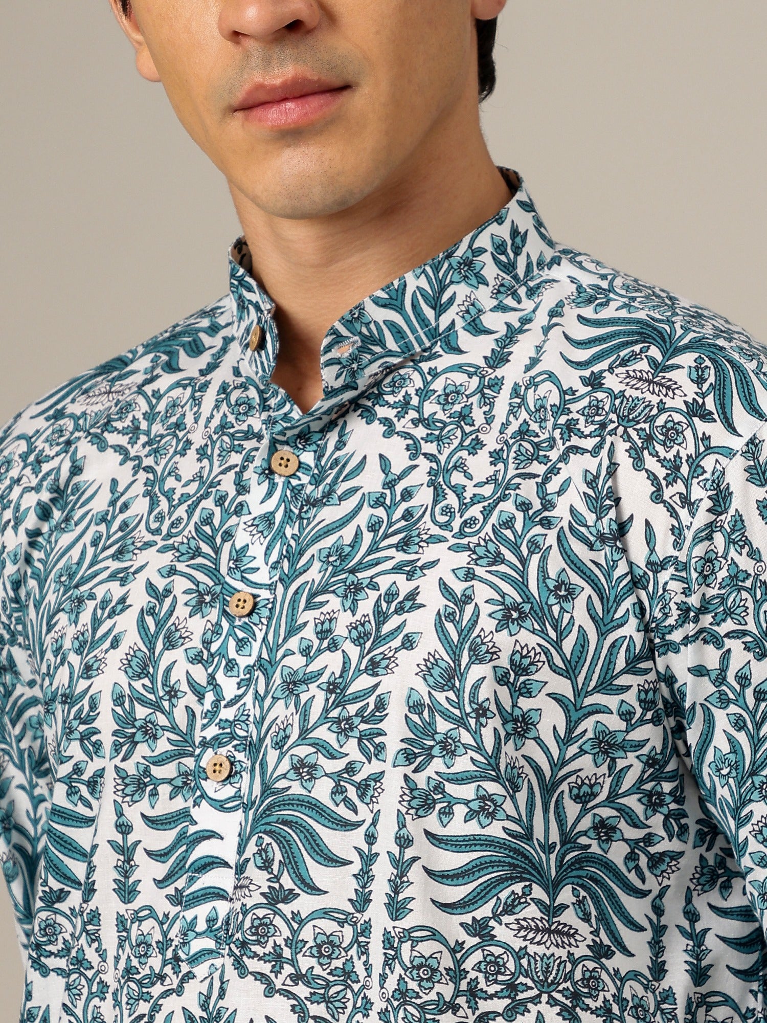 White & Blue: Floral Printed Mandarin Collar Kurta