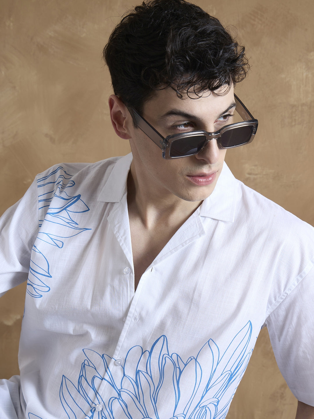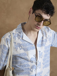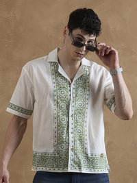 Made from breathable cotton, this oversized shirt features placement prints, a Cuban collar, drop shoulders, half sleeves, and a straight hemline—ideal for versatile, easygoing, and contemporary styling.