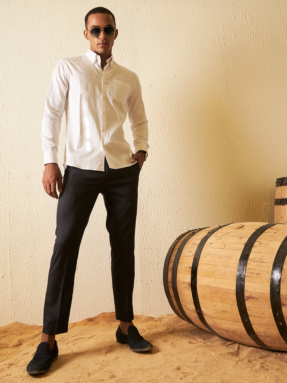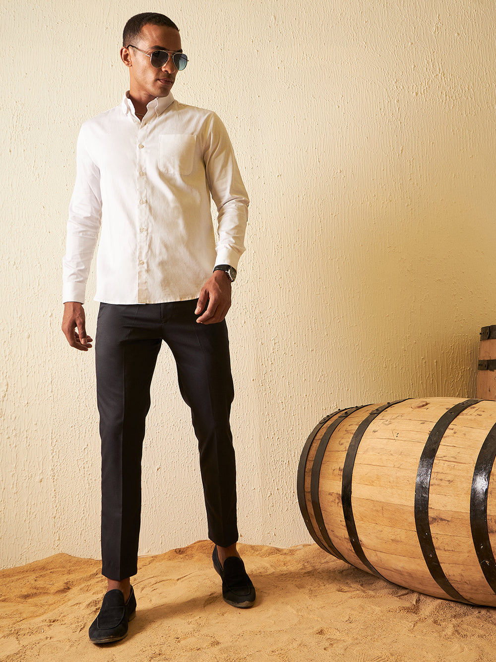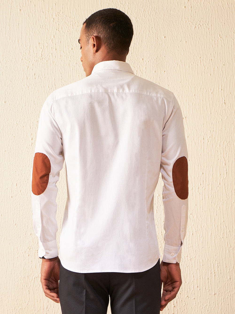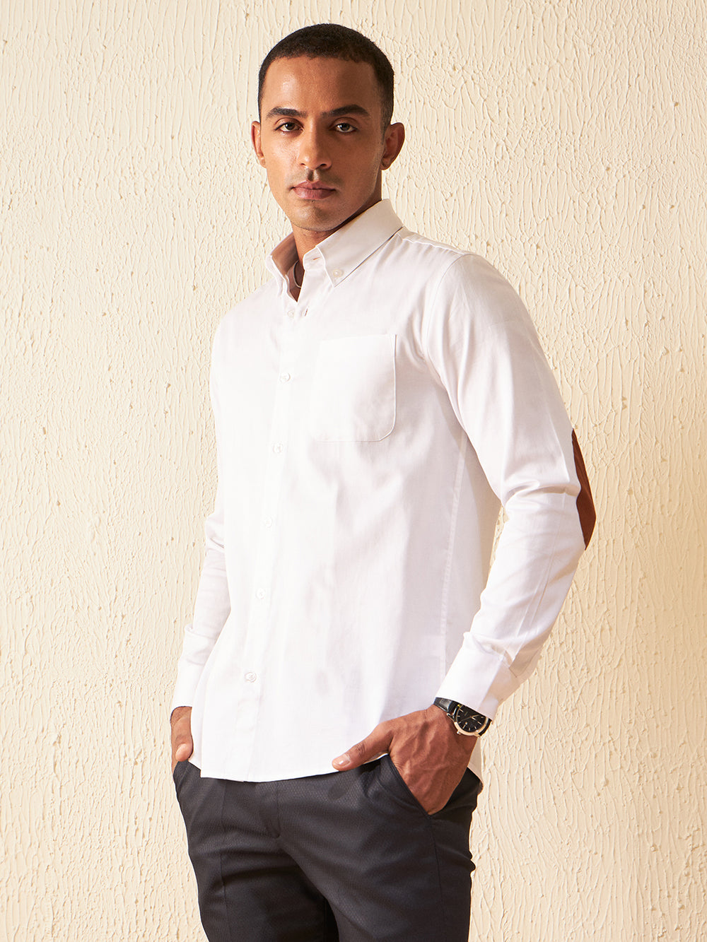 White solid opaque Formal shirt ,has a button-down collar, button placket, 1 patch pocket, long regular sleeves with elbow patch, curved hem