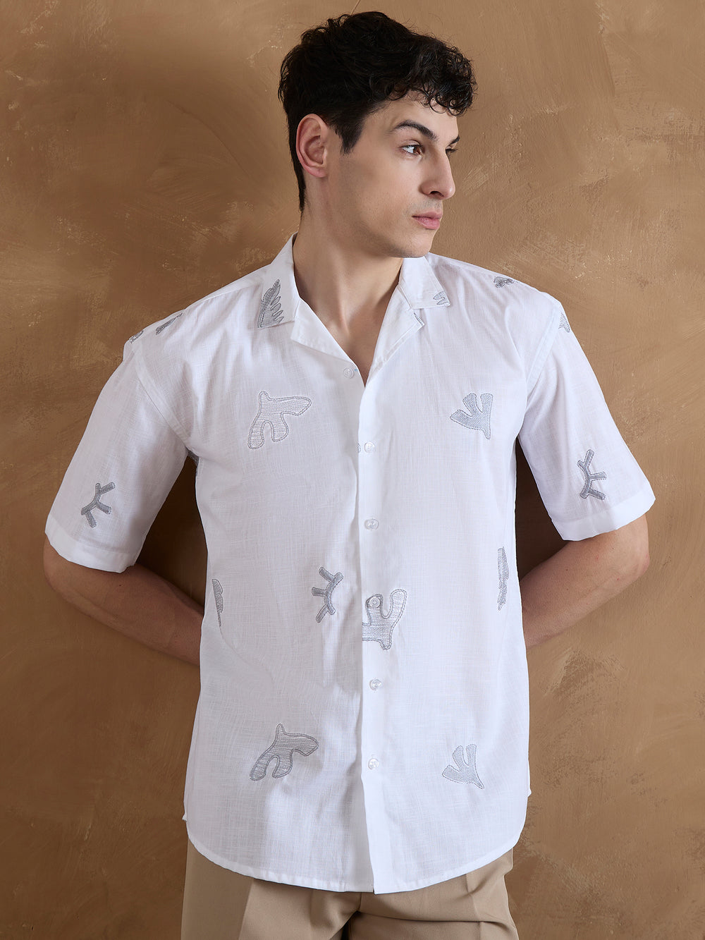 Elevate your casual style with this cotton embroidered shirt from Dennison. Featuring delicate embroidery, a relaxed Cuban collar, and drop shoulders, it blends craftsmanship with modern design. The oversized silhouette and curved hem make it an easy statement piece for those who appreciate subtle detail and breezy comfort.