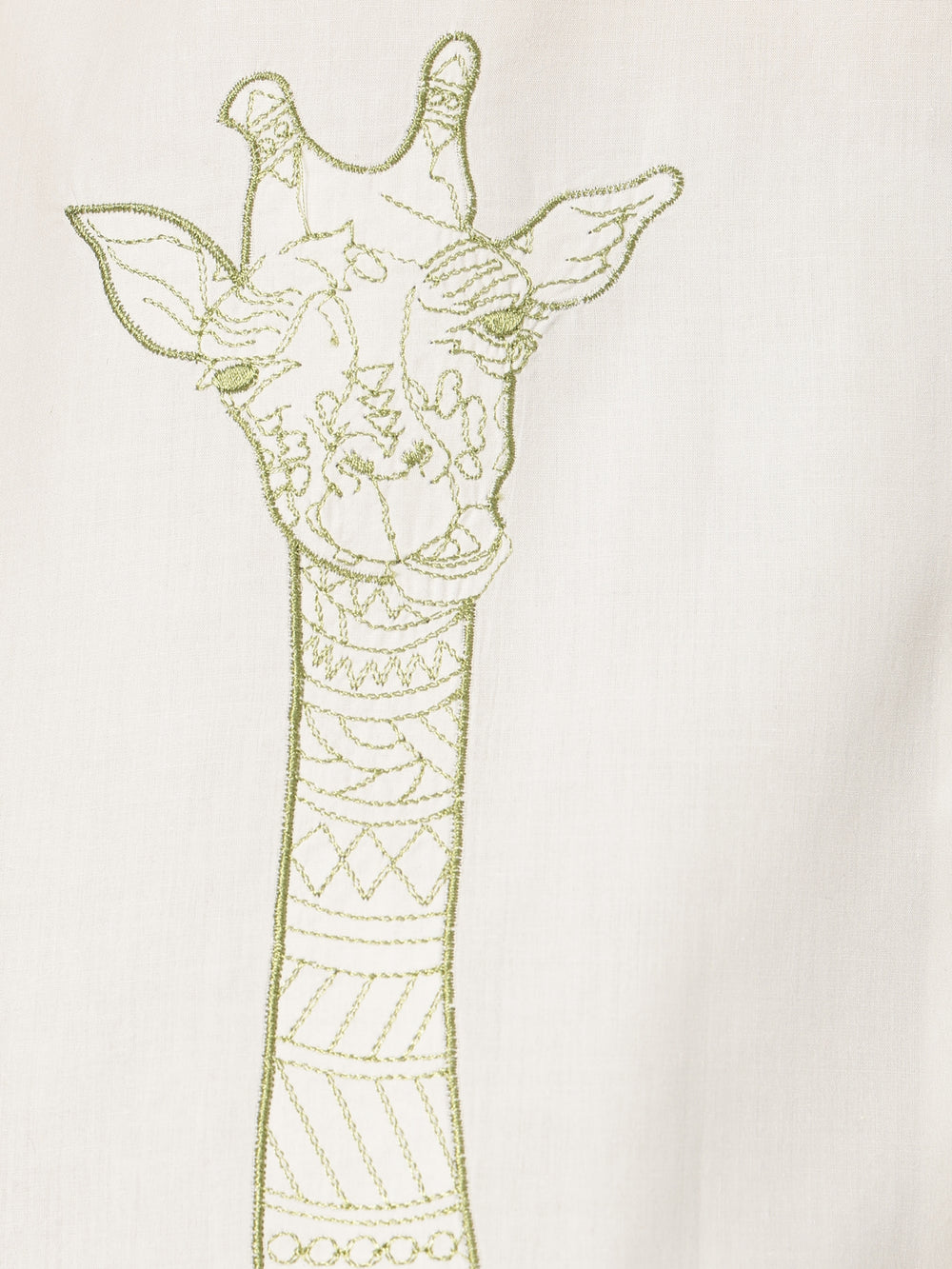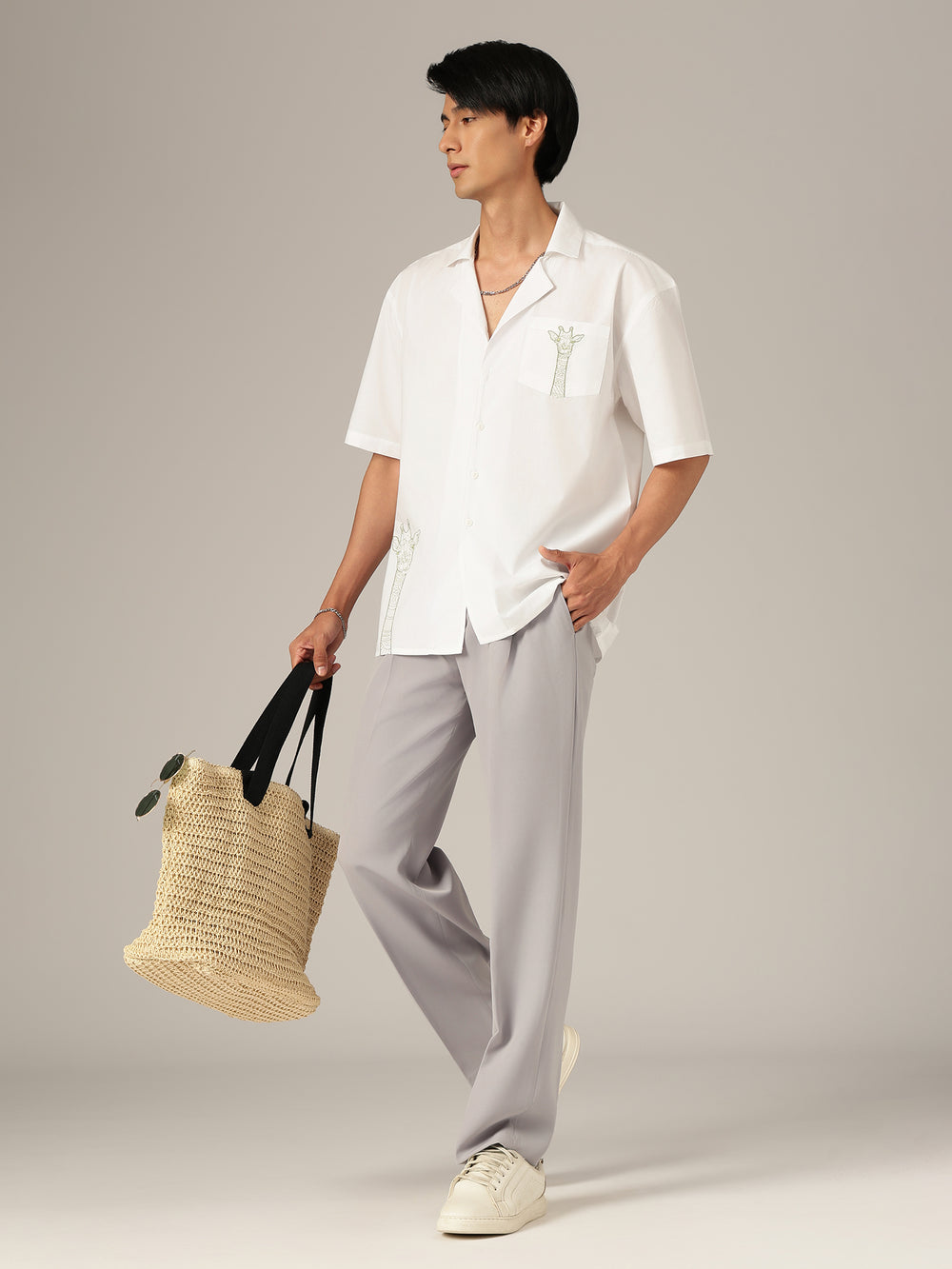 This embroidered Cuban-collar shirt blends relaxed structure with refined detailing. Its oversized silhouette and drop-shoulder cut create a modern, effortless vibe, perfect for elevating simple everyday looks with subtle sophistication.