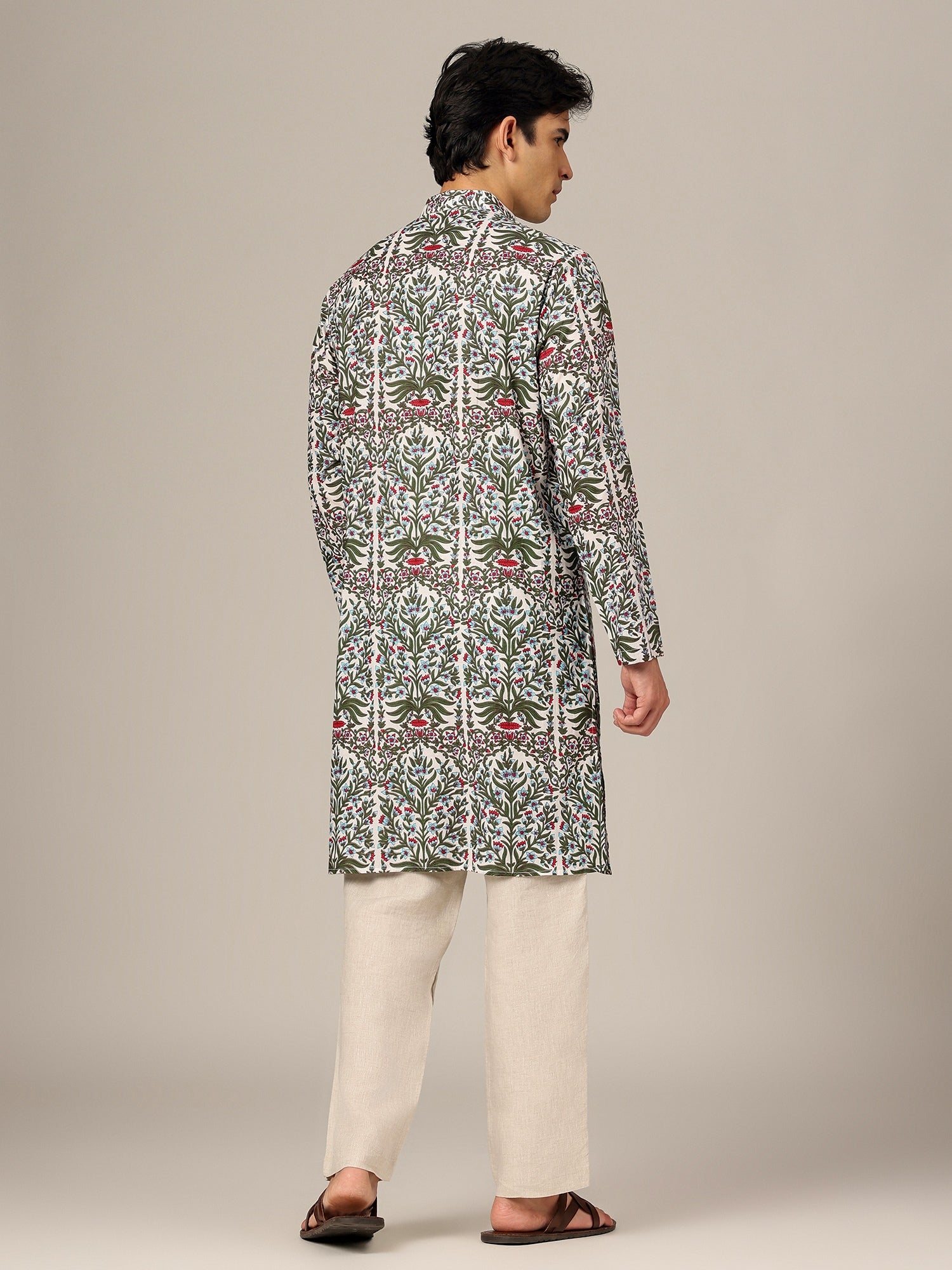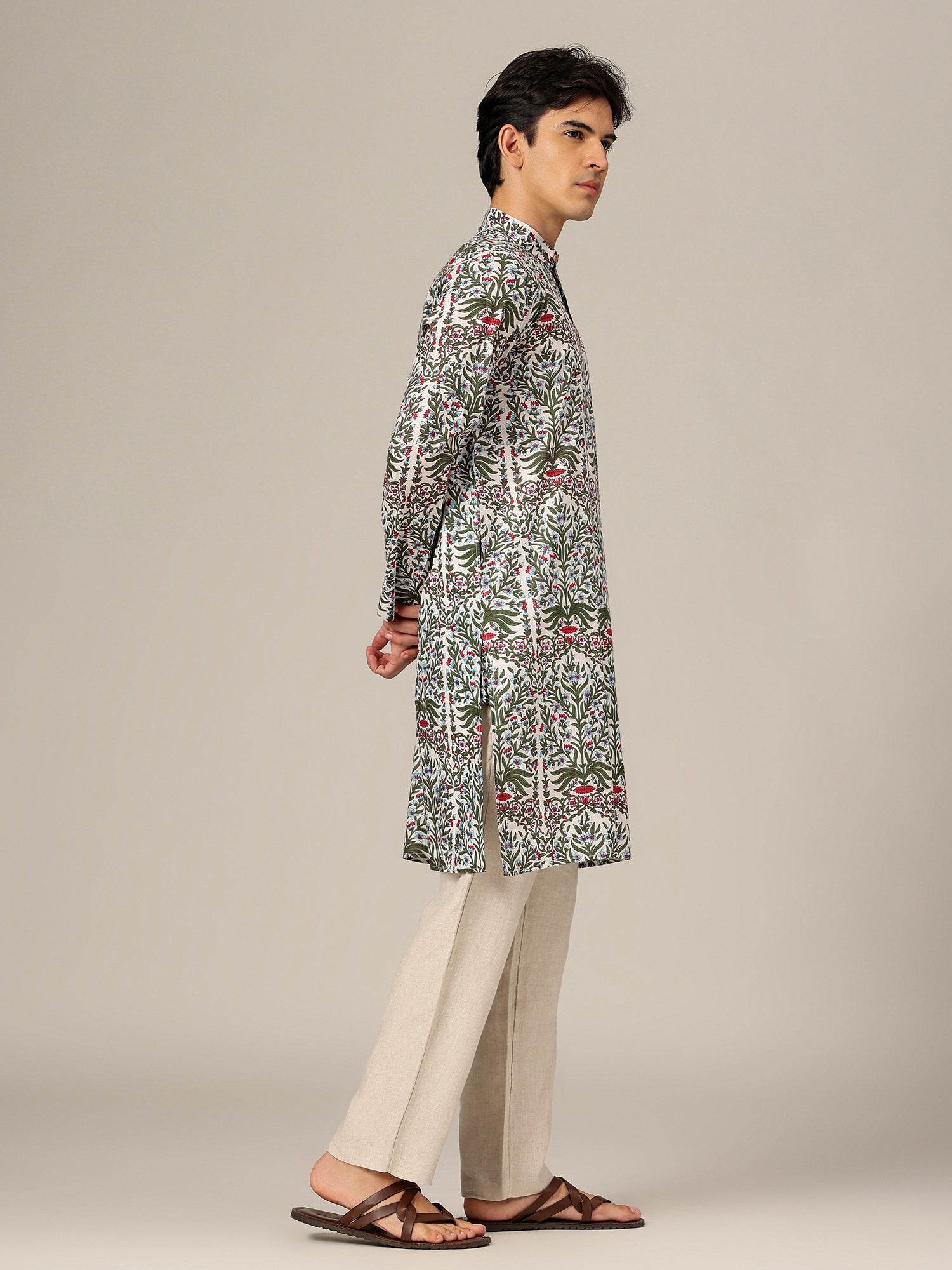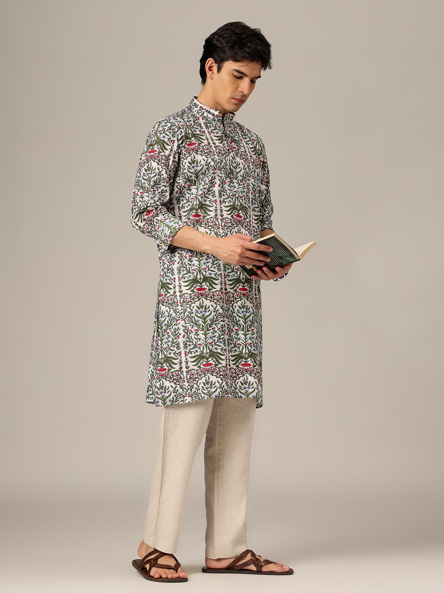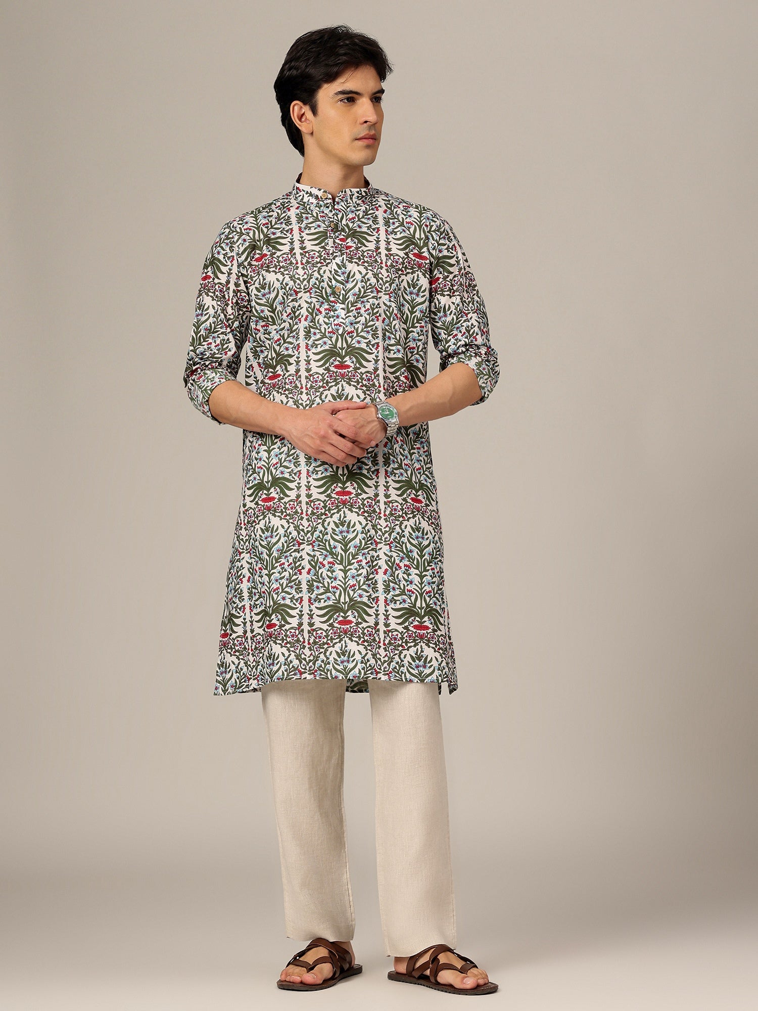 This Regular Fit Floral Printed Kurta is crafted from breathable cotton and features a Mandarin collar, long sleeves, and two pockets. Designed in a straight shape with side slits, it offers comfort and effortless charm.