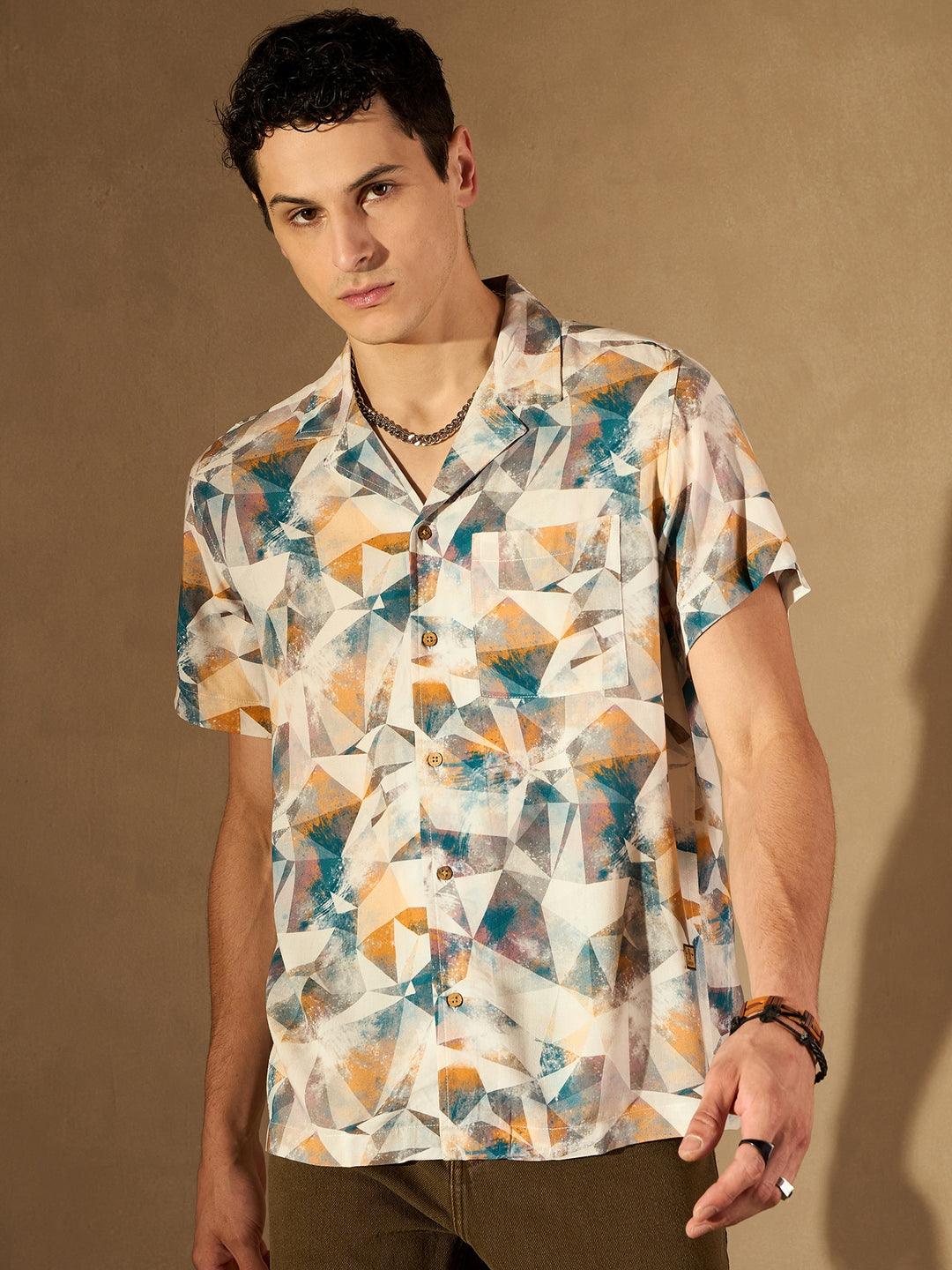 White & Grey abstract printed opaque casual shirt ,has a cuban collar, button placket, 1 patch pocket, short regular sleeves, curved hem