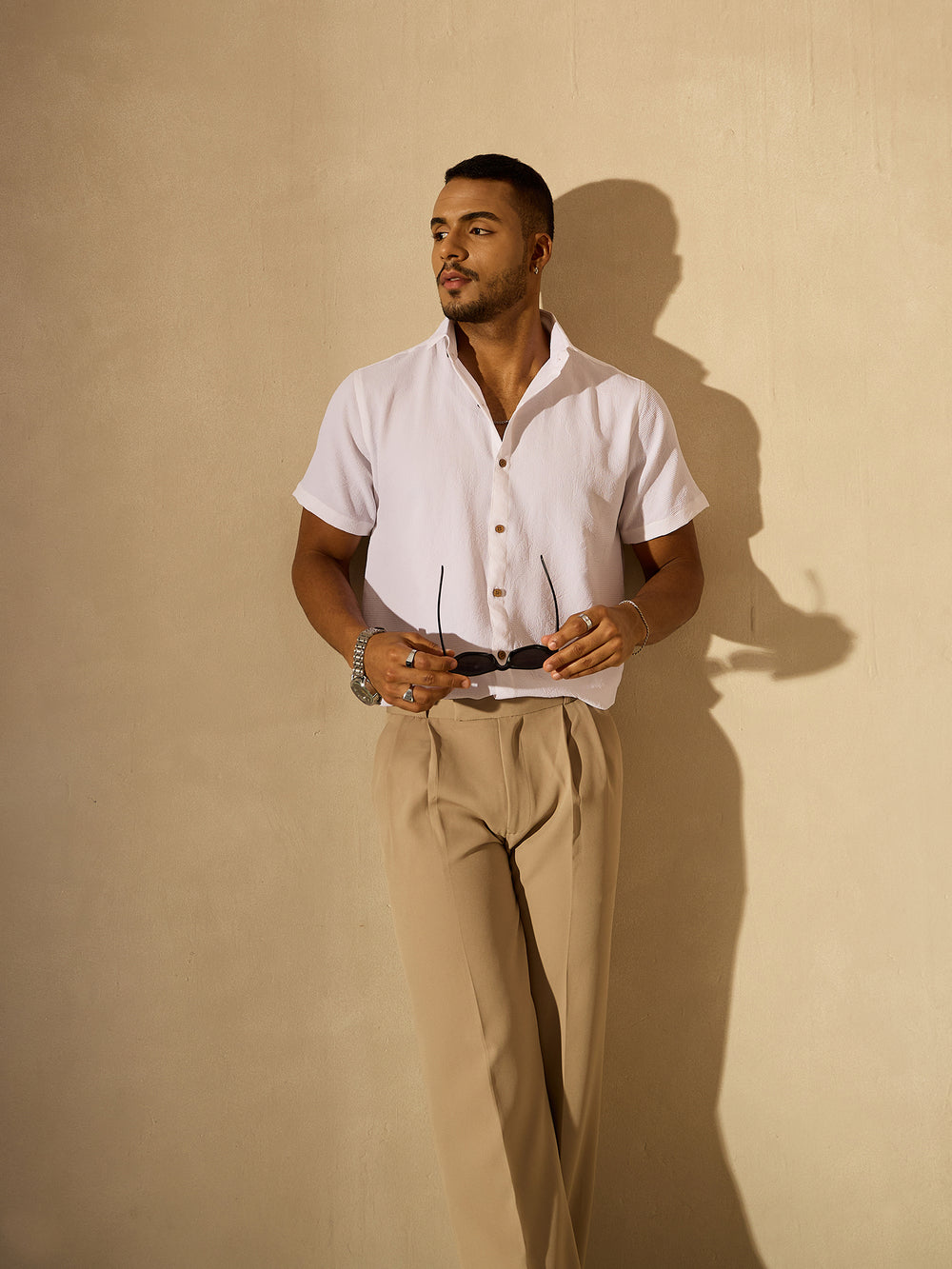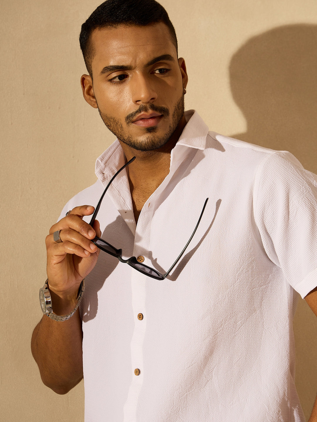 White opaque casual shirt has a spread collar, button placket, short regular sleeves, curved hem
