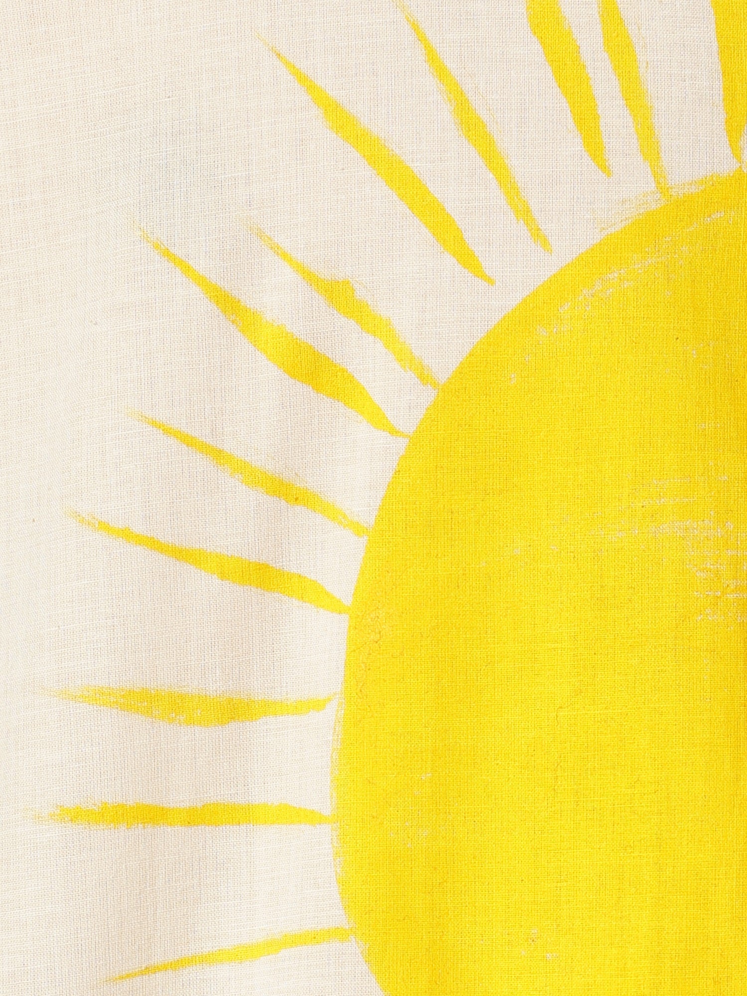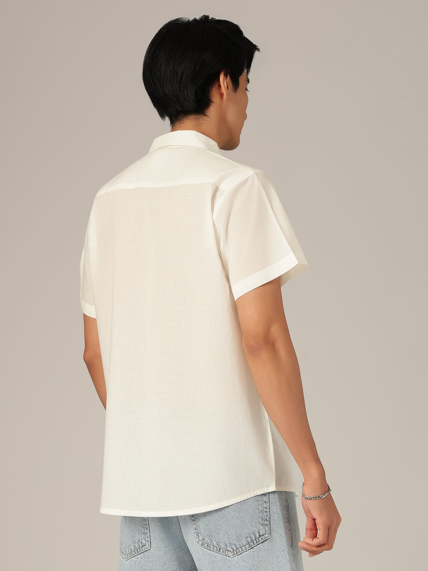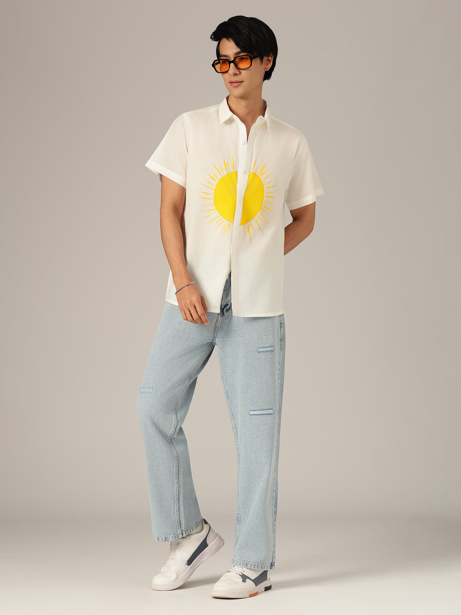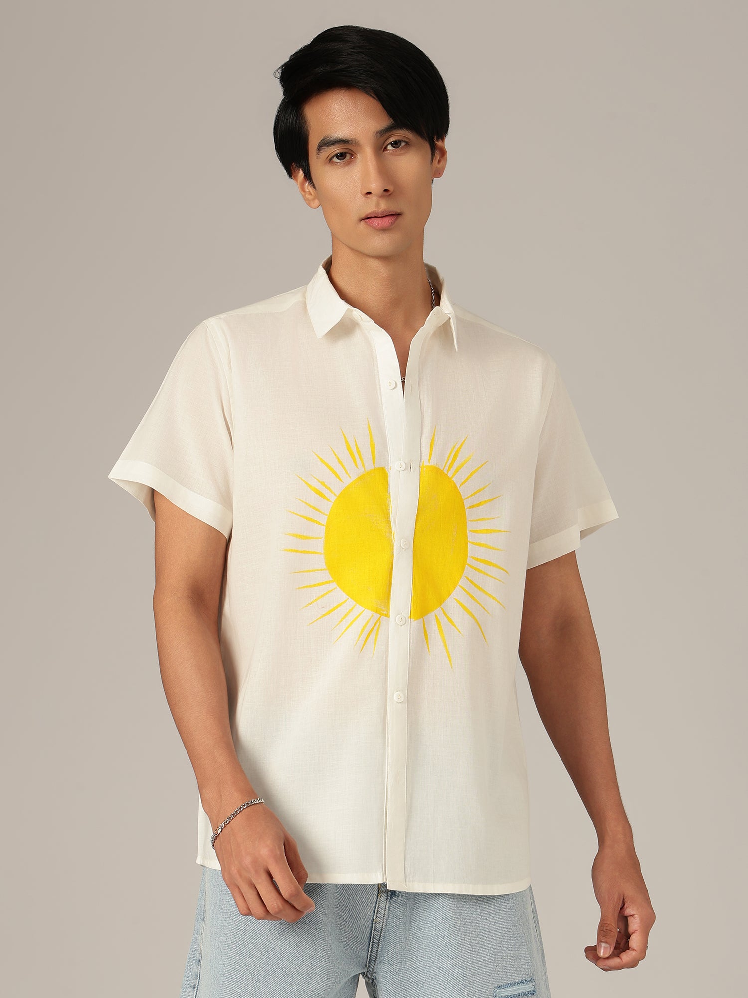 Casual shirt with hand brushpainted detailing, relaxed fit, half sleeves, spread collar, no pocket design, and curved hemline. Lightweight fabric ensures breathable comfort and effortless movement for everyday wear in warm weather.