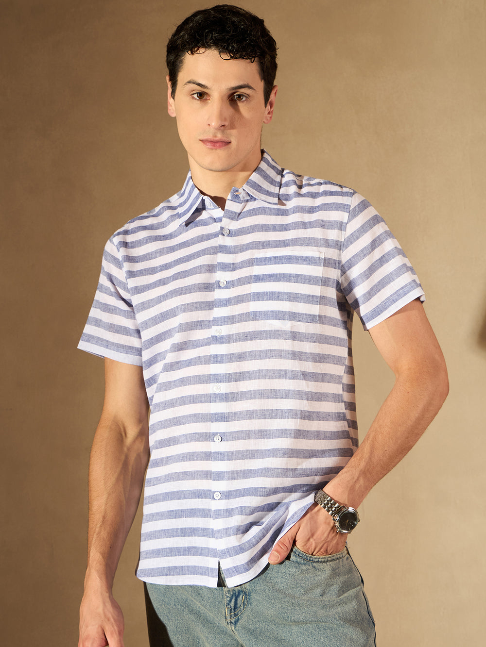 Unleash your daring spirit with this white and blue horizontal striped cotton shirt! It features a spread collar, button placket, 1 patch pocket, short regular sleeves, and a curved hem for a bold and confident style that will make you stand out from the crowd