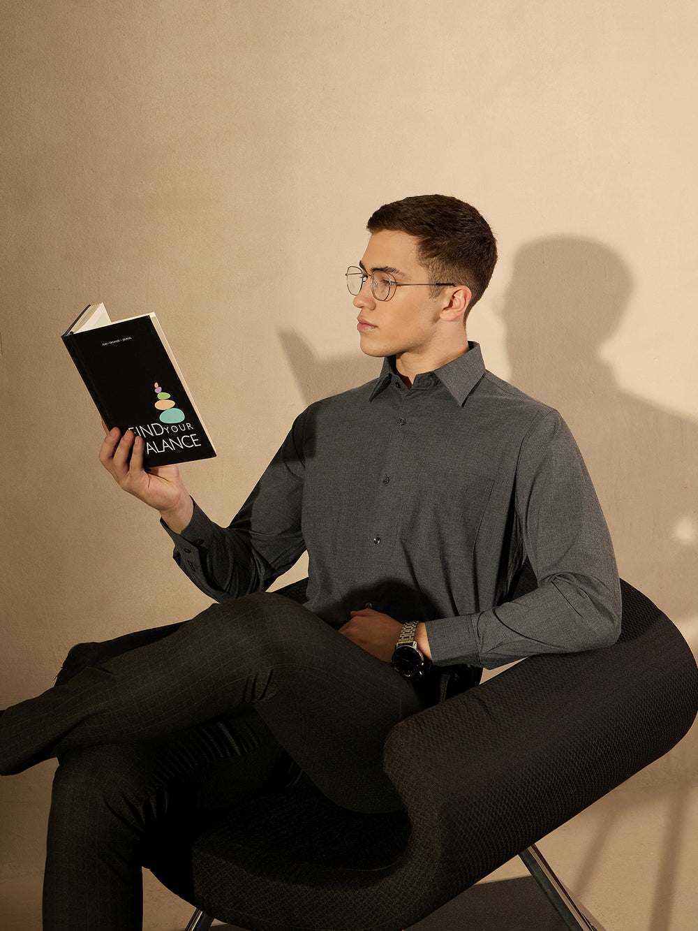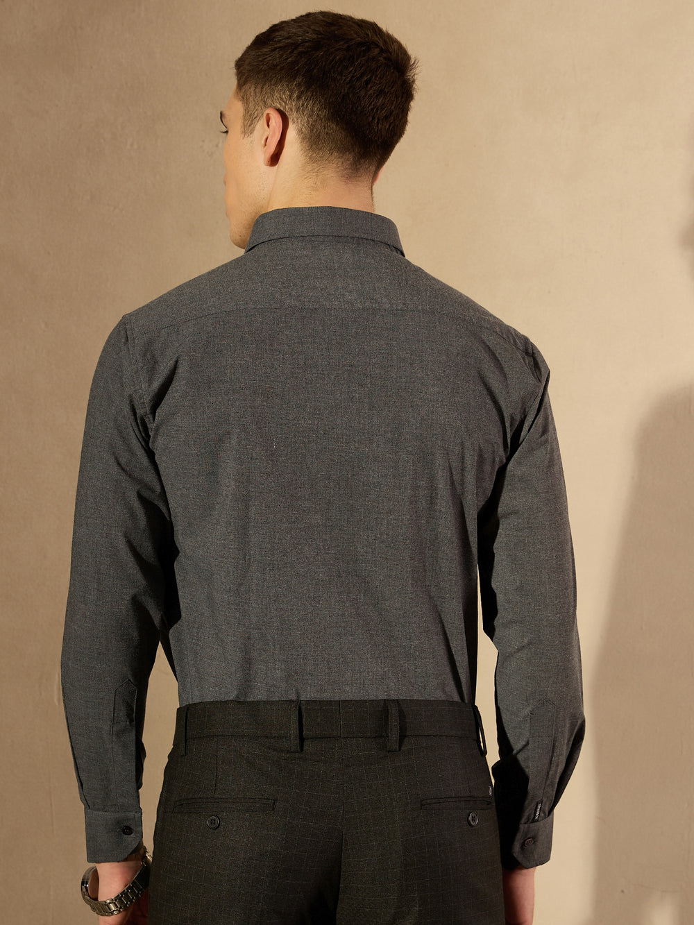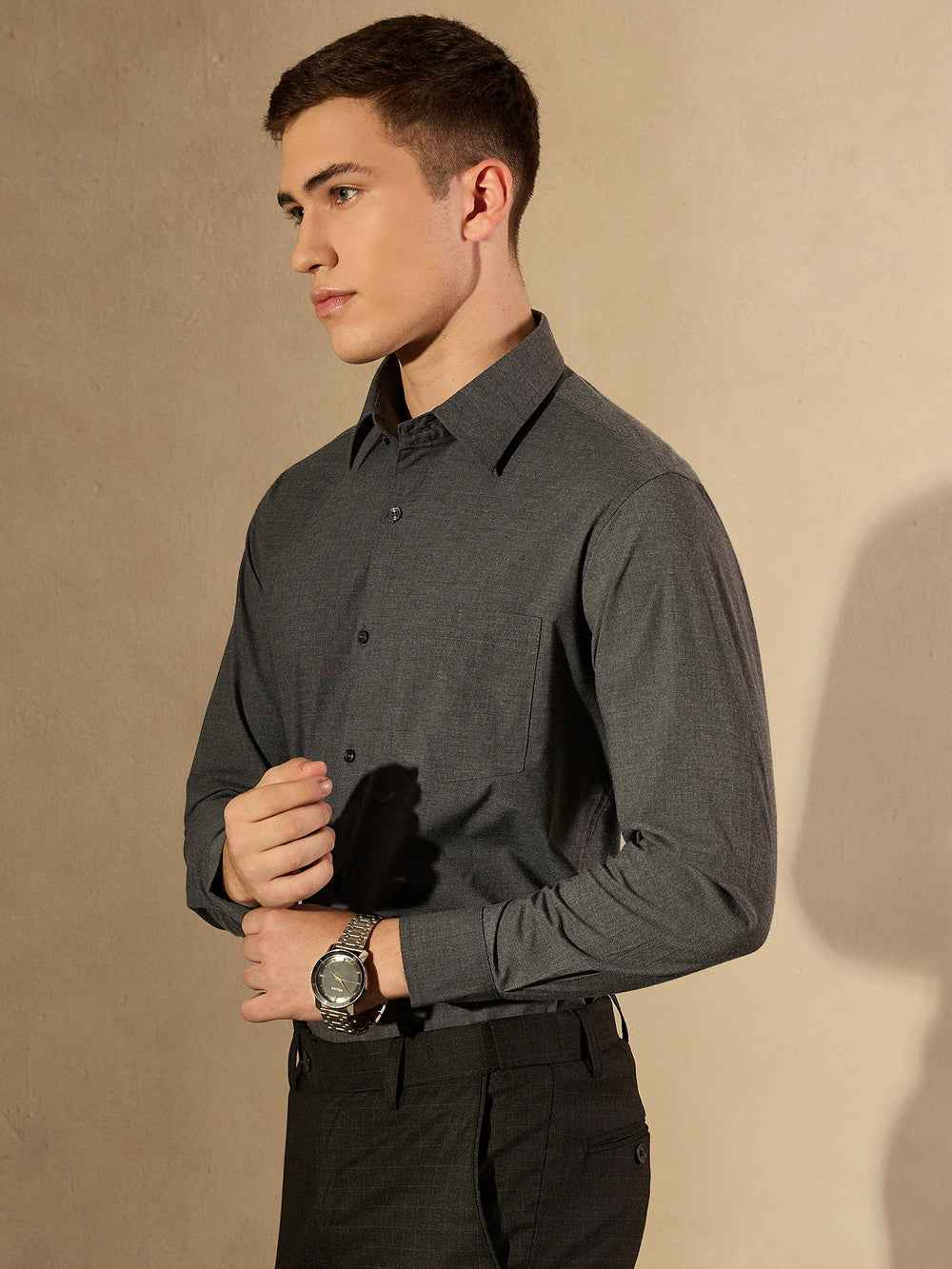 Grey Lycra opaque formal shirt, has a spread collar, button placket, long regular sleeves, curved hem