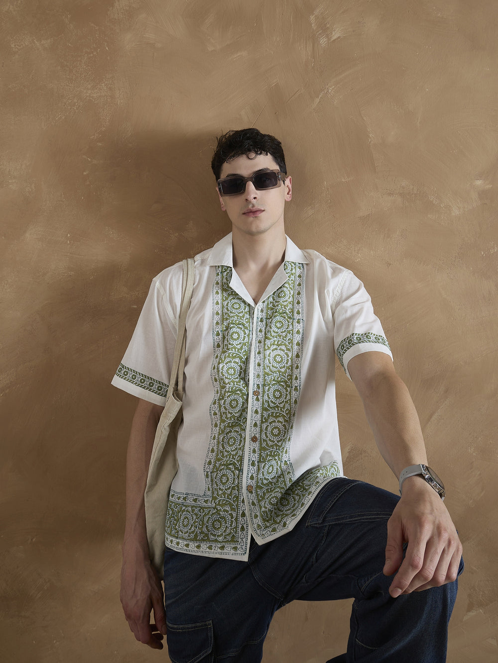 This hand block printed oversized shirt from Dennison brings artisanal charm to modern silhouettes. With a Cuban collar, drop shoulders, and a straight hemline, it's the perfect blend of tradition and trend. Ideal for those who like to keep it cool yet cultured.