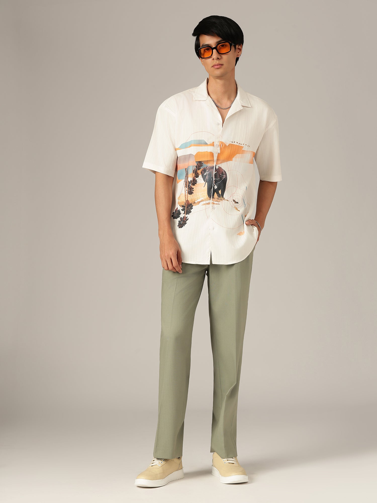 This Oversize Fit Placement Printed Shirt crafted from soft Viscose Rayon features half sleeves, a relaxed drop-shoulder, Cuban collar, curved hemline, and a textured finish. A stylish casual shirt blending comfort with artistic printed detailing.