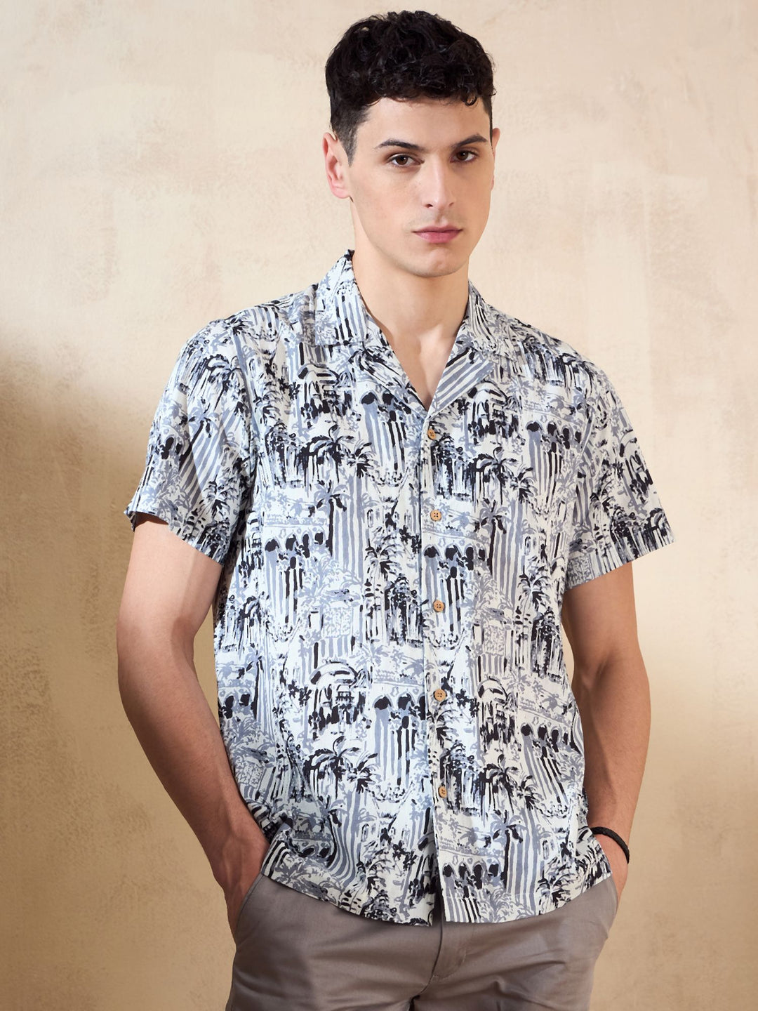 White floral printed opaque Casual shirt, has a Cuban collar, button placket, short regular sleeves, curved hem