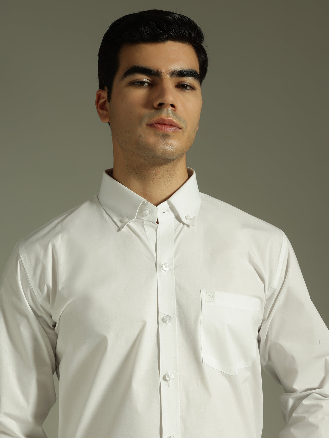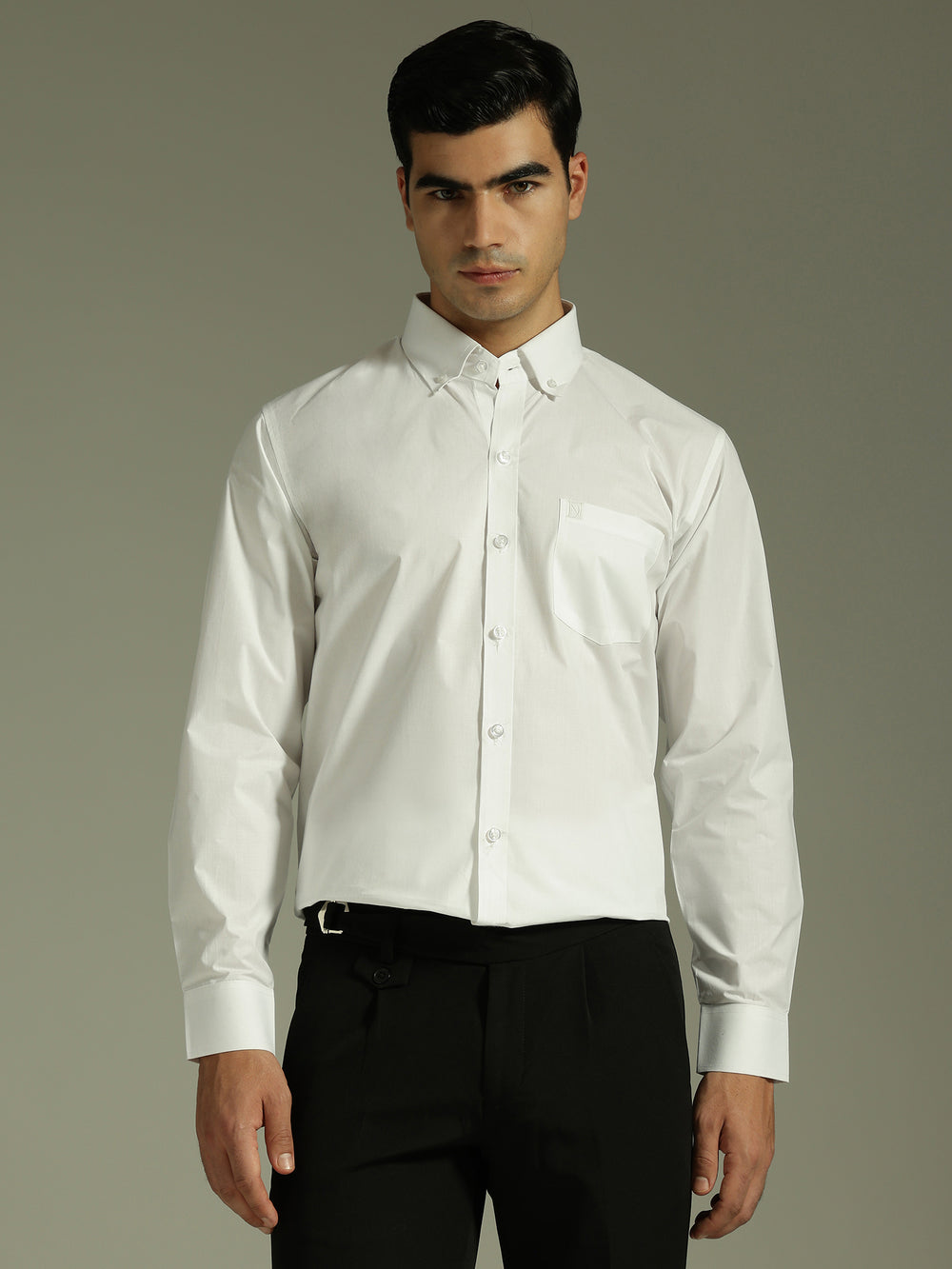This Regular Fit Formal Shirt is crafted from premium cotton and features a classic Button Down Collar, Full Sleeves, a Curved Hemline, and an Embroidered Brand Logo on the Pocket for a refined finish.