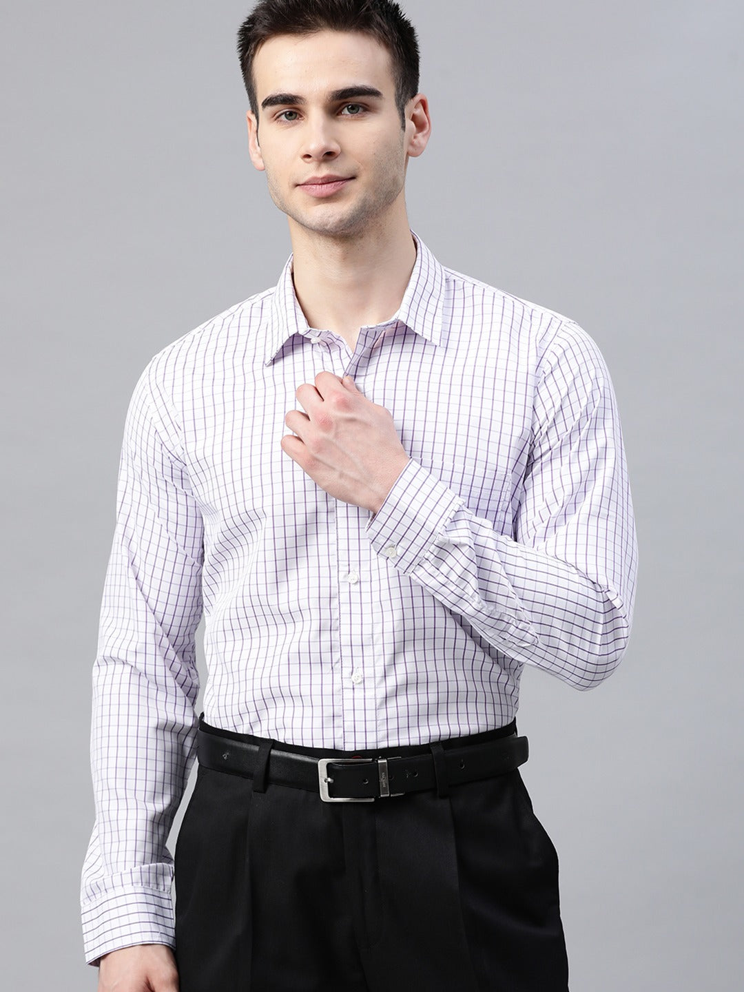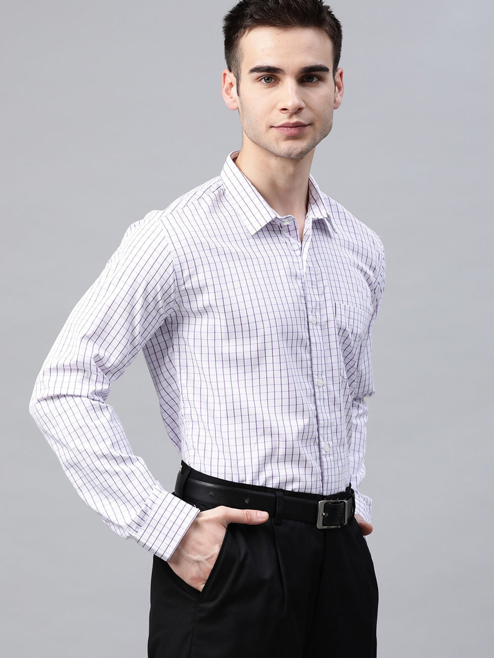 White & Purple grid tattersall checks checked opaque Formal shirt ,has a Spread collar, button placket, 1 patch pocket, long regular sleeves, curved hem