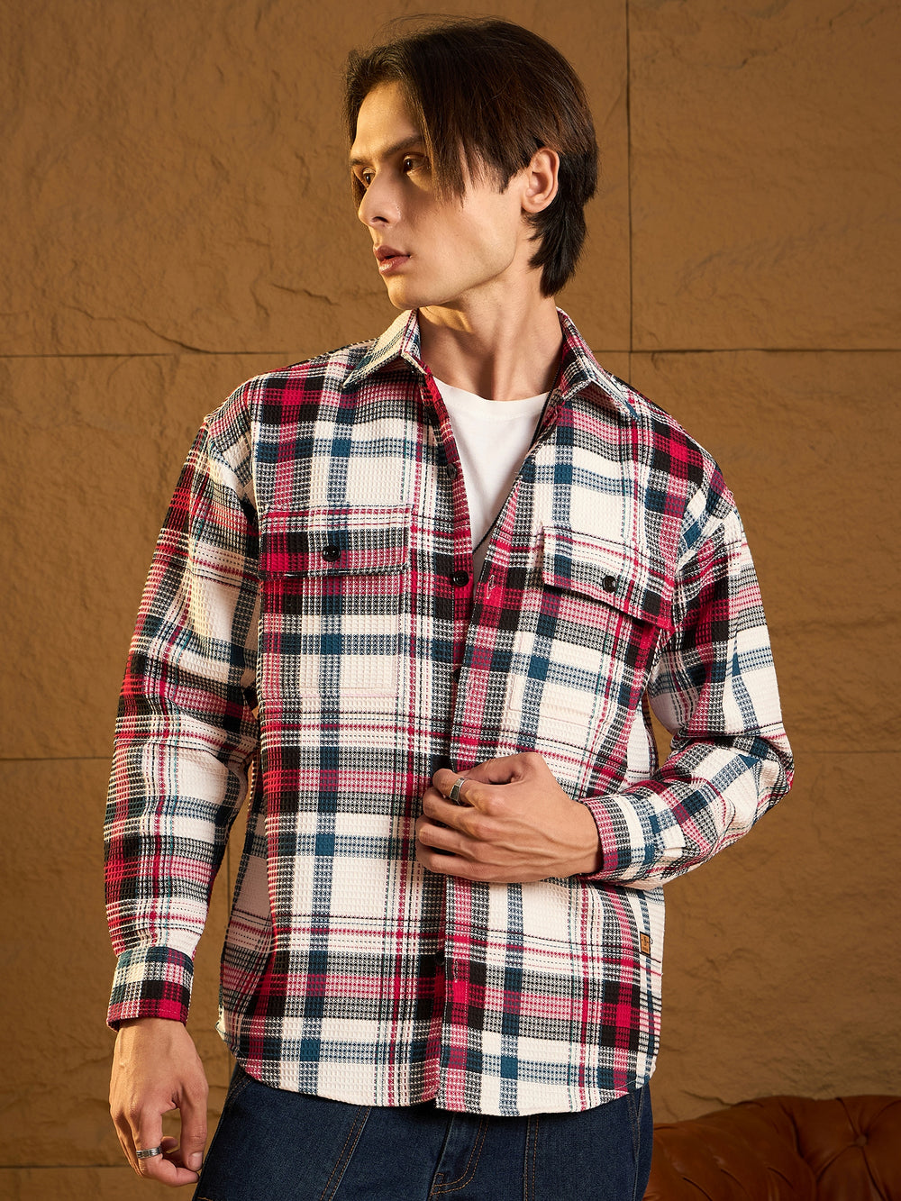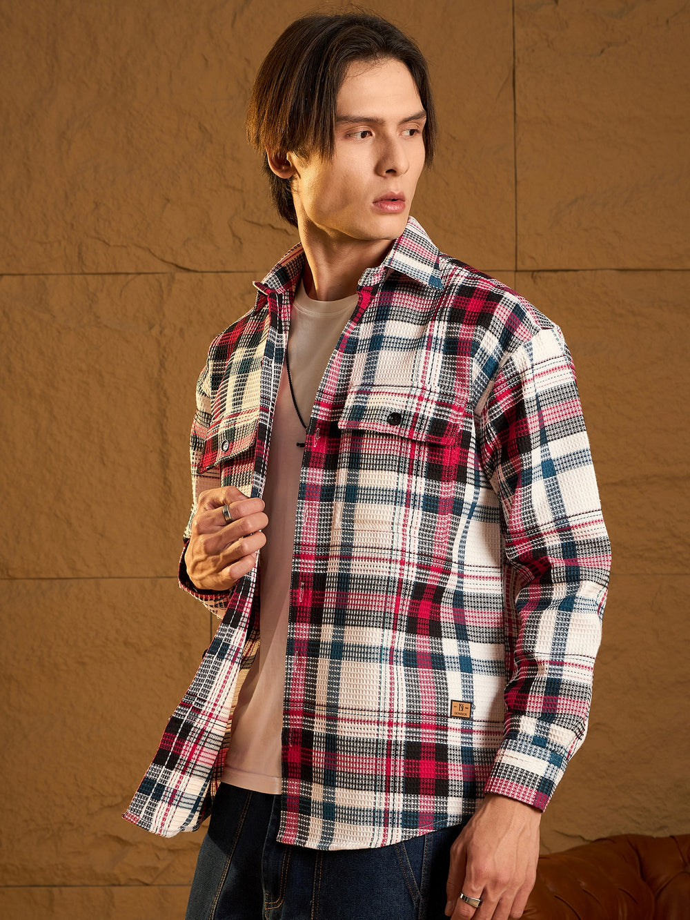 White and Red checked shacket featuring a spread collar, drop shoulders, oversized fit, full sleeves, 2 Flap pockets, and a stylish curved hemline