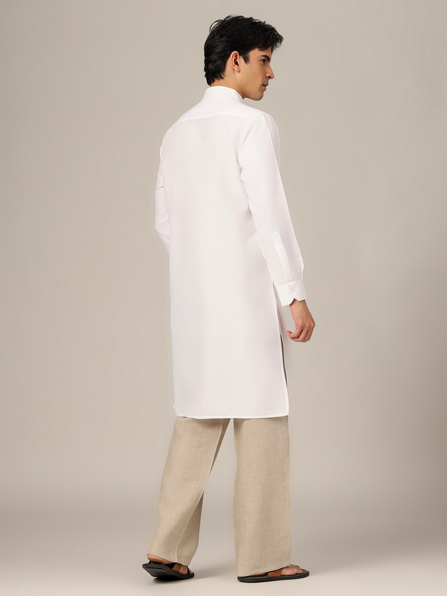 This Regular Fit Solid Spread Collar Kurta is crafted from soft cotton and designed with long sleeves, two pockets, and side slits. The knee-length, straight shape ensures all-day comfort with a clean, modern look.