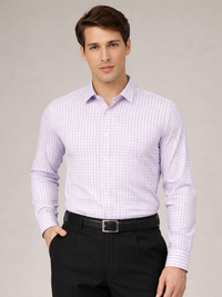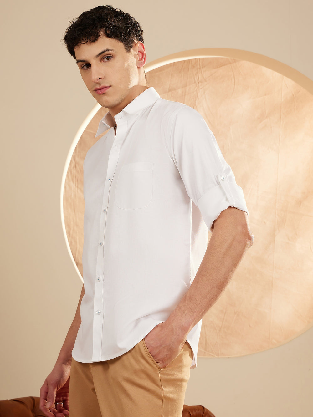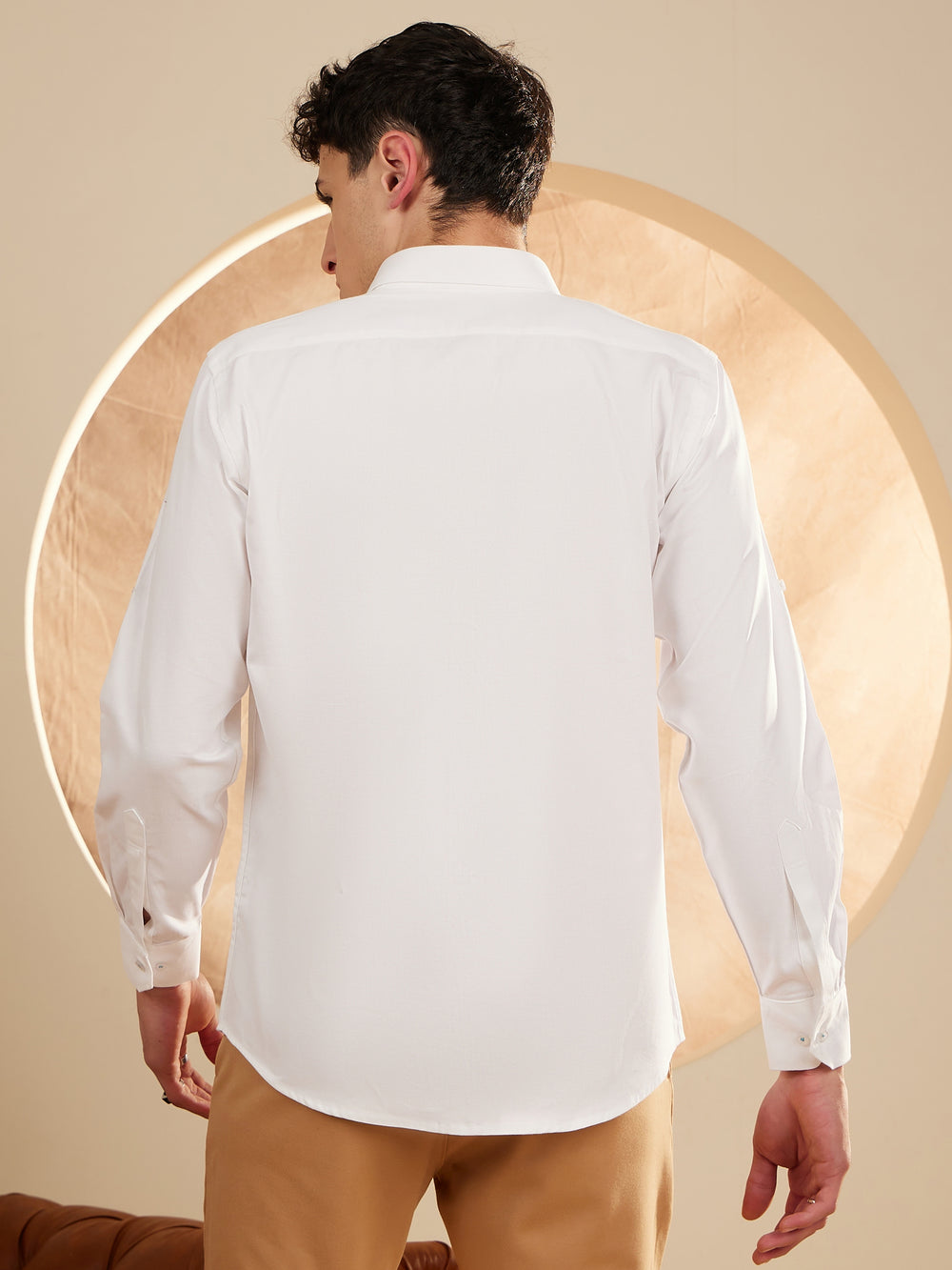 White solid formal shirt, has a cutaway collar, long sleeves, button placket, curved hem, and 1 patch pocket