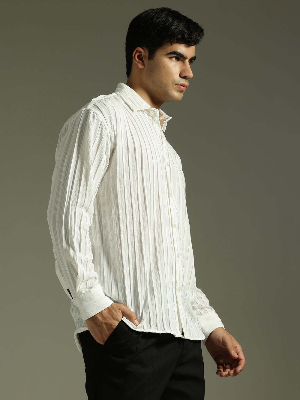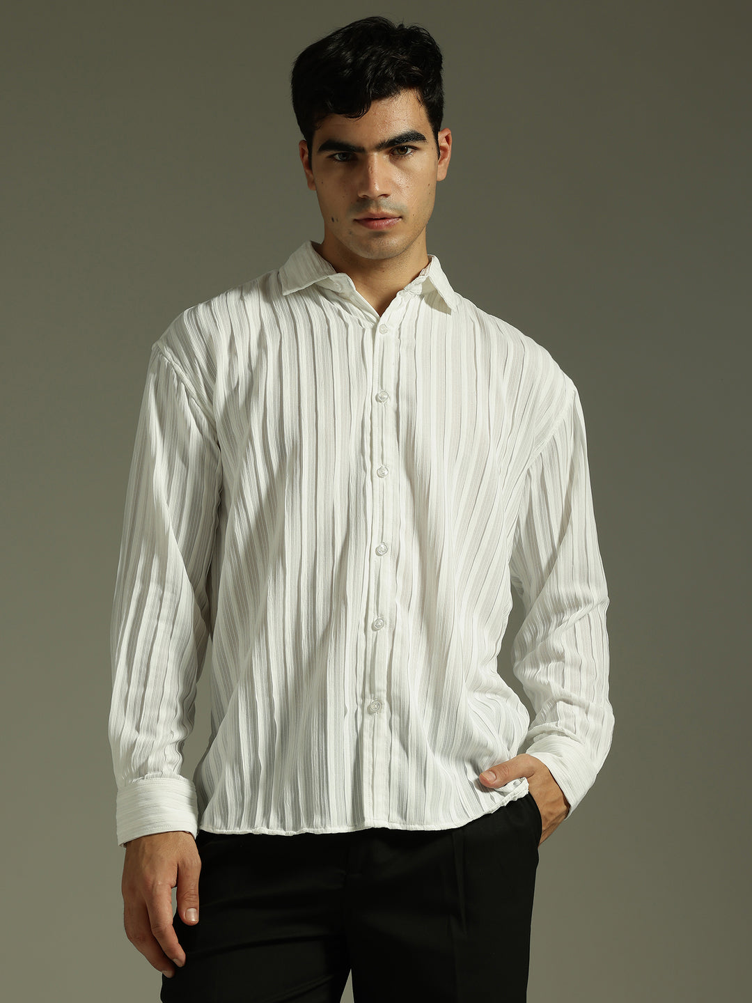 With its pleated texture and relaxed silhouette, this shirt blends structure with comfort—ideal for achieving a stylish yet laid-back casual look effortlessly.