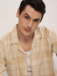 Crafted from soft cotton fabric, this oversized check shirt features a Cuban collar, drop shoulders, Long sleeves, and a curved hemline—ideal for breathable, everyday casual style with a trendy edge.